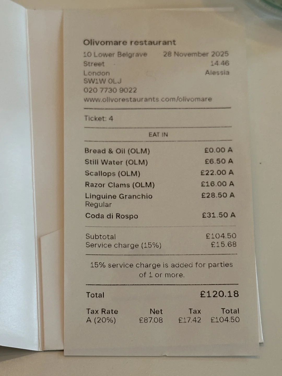这家对我而言,完美诠释小而美,简单美味。如果喜欢酱汁浓郁的那种鲜意大利面的话(我不太喜欢)那这家可能吃着会寡淡一些。如果和我一样喜欢简单但是层次丰富的美味,那这家的pasta应该会深得你欢心。