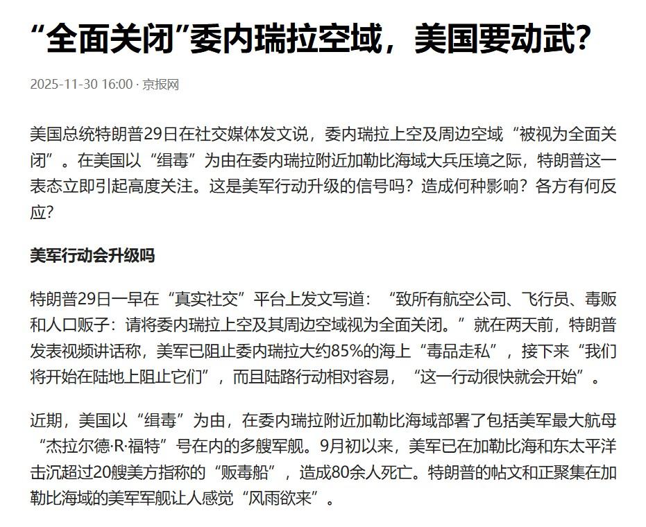 不得不承认,美国是当今世界最大的霸权主义国家,也是世界上实力最强大的国家。美国敢对世界上任何国家指手画脚,对小国家更是想打谁就打谁。特朗普公开说要关闭委内瑞拉空域,虽然他从法律上不具有这样的权力,但实际上各国都会认为美国会这样做,否则谁真进入了这一空域很可能会受到打击。这就是美国的霸道,也是实力决定的,目前很多国家只能被它欺负。等到美国继续作恶到一定程度,就会招来猛烈报复,想想当年的911吧。