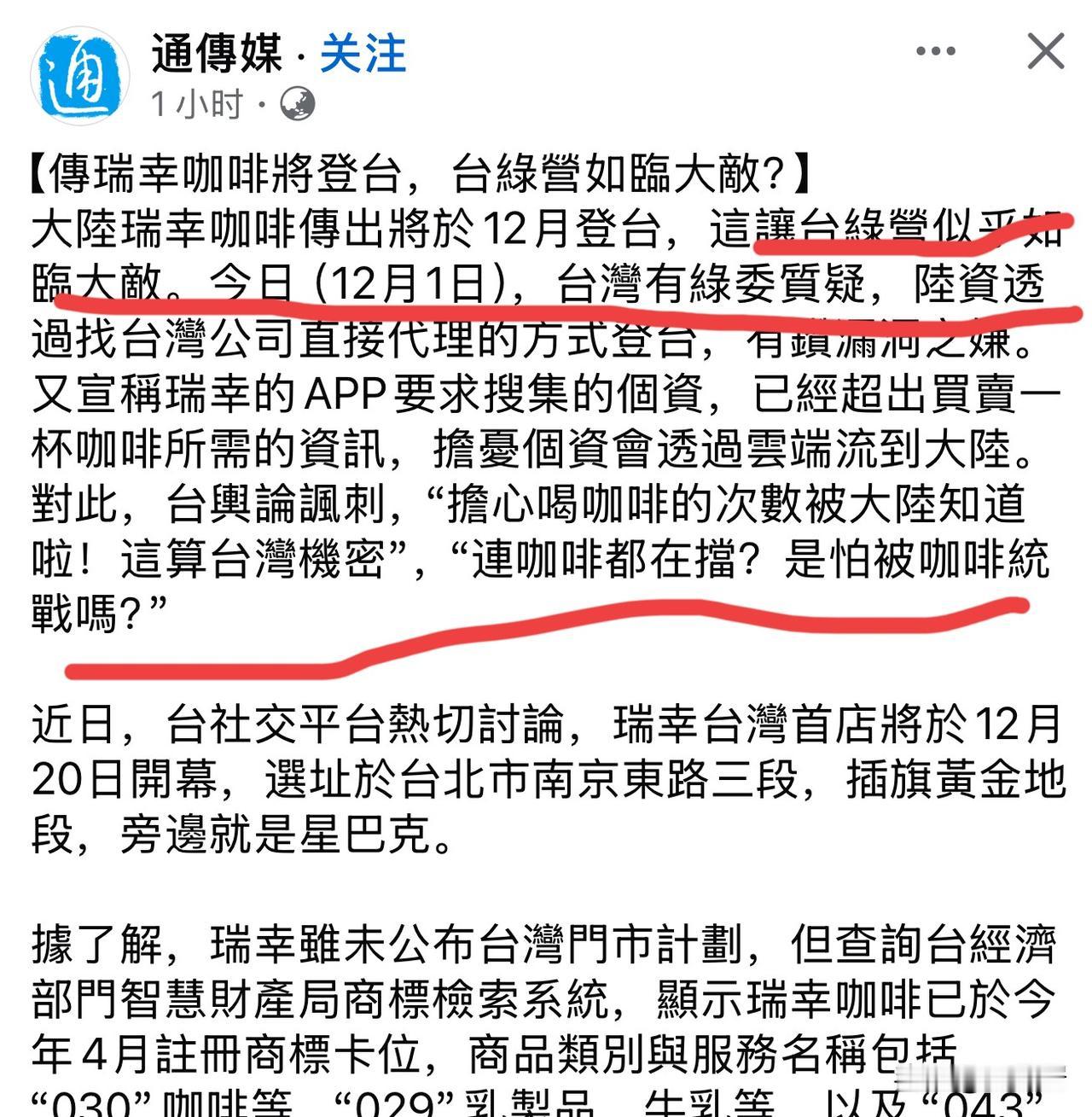瑞幸咖啡将登陆台湾省,绿营如临大敌,查这查那的……一杯咖啡而已,就让绿营惊慌失措!就让岛上绿营大做文章,扯上“政治”。可见,绿营草木皆兵也。