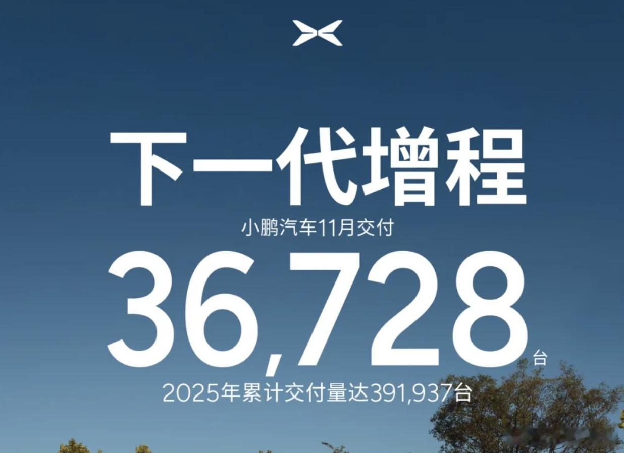 2025年11月,小鹏汽车共交付新车36,728台,同比增长19%。2025年1-11月,小鹏汽车累计交付391,937台,同比增长156%。新能源汽车大V聊车小鹏汽车