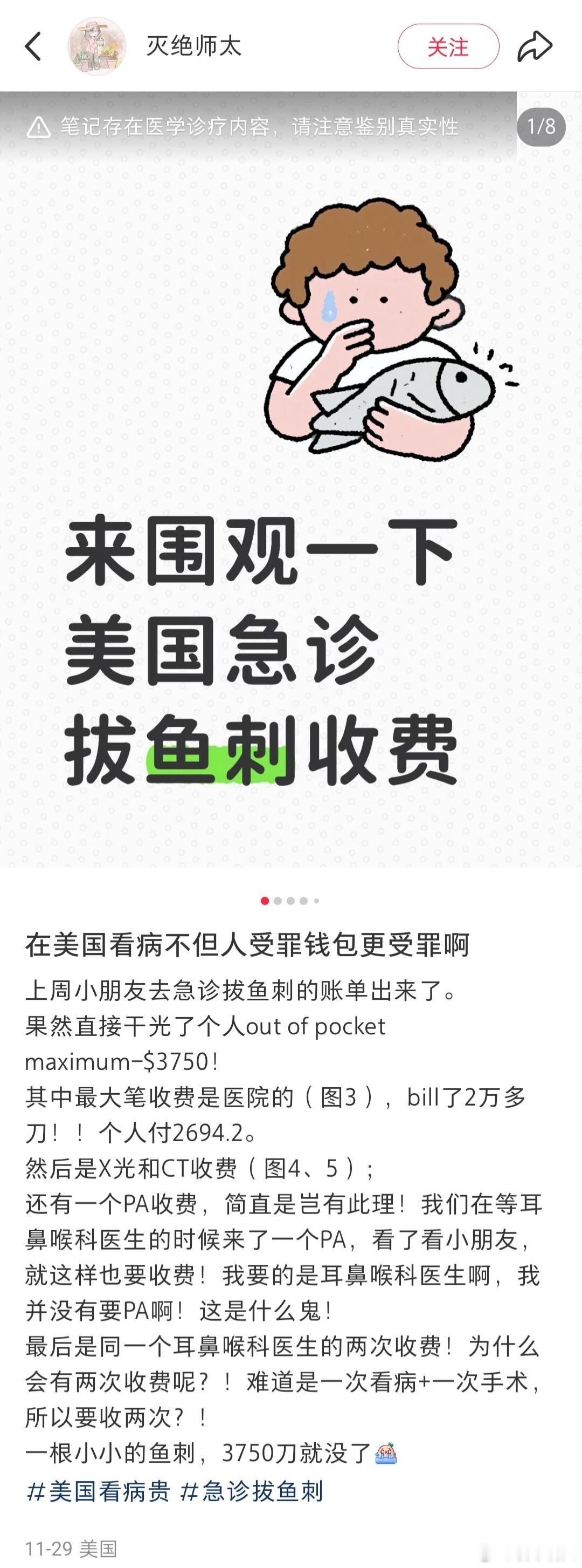 美国拔鱼刺花3750美元为什么感觉在美国花3750美元拔鱼刺很正常呢!这至少还是拔了个鱼刺。之前甜甜圈在美国话疗也是花了几千美元啊!海外新鲜事