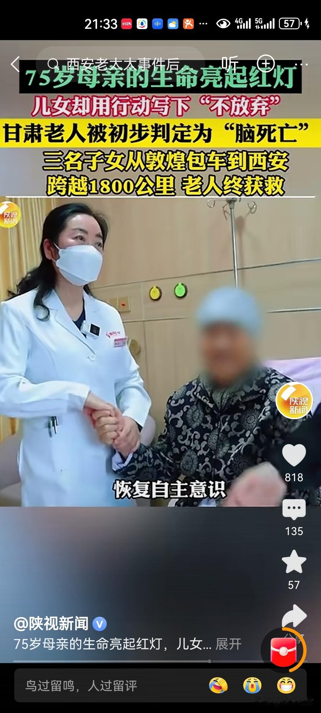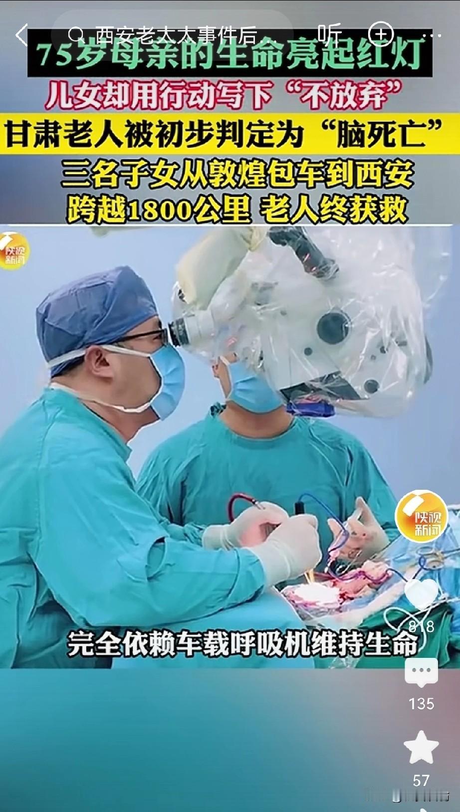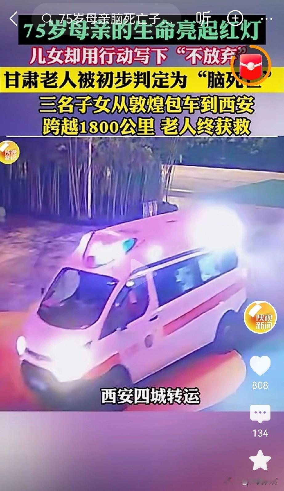 当自己年已七旬的母亲被多家医院宣布为脑死亡时,你会怎么做?最近一个关于爱心与孝心的故事在古城西安流传。 今年11月初,甘肃敦煌75岁的刘老太突发剧烈头痛倒地,被紧急送进医院,因颅内肿瘤破裂,出血量达到了120毫升,被当地多家医院判定为脑死亡,要家属准备后事。老人的三名子女听闻抱头痛哭。但哭过之后,他们还是不愿放弃。哪怕有万分之一的可能,哪怕花光所有的钱都不能放弃,不然他们会愧悔终身的。兄妹三毅然包下救护车,跨越1800公里,历经敦煌,酒泉,兰州,西安四城转运,仅车费就花了4万多元。 西安国际医学中心医生接诊时,患者已出现脑疝,一侧瞳孔散大,完全依赖车载呼吸机维持生命。老人的子女对医生一再请求到,请你们一定再试试,我们不能这样将母亲再拉回去。面对子女们的殷切期待,医生们对老人进行了全力救治。术后三天,老人就恢复自主意识,成功脱离呼吸机。半个月后老人生活已能自理。 茫茫戈壁,到古城西安,儿女们堵上所有的期盼,只为给母亲多一次机会。医生说,是家属的坚持,为我们创造了救人的可能。奇迹从不是从空降临,而是爱与坚持的双向奔赴。 在人们为三兄妹的孝心感动时,也有网友说,光有孝心没有钱也不行啊。因此好好挣钱吧,你银行卡的数字足够多,就是对家人最大的爱。对此,你怎么看?