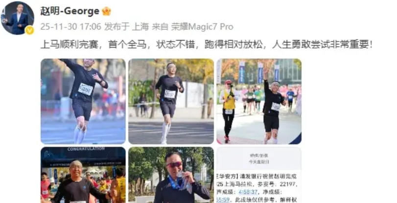 【赵明现身:跑完上马全马,仍在用荣耀旗舰,谈未来动向】 荣耀前CEO赵明近日顺利完赛上海马拉松全马。值得注意的是,他微博小尾巴仍显示为荣耀Magic7 Pro。 谈及未来,他表示正在观察行业,寻找像当年做荣耀一样、值得全情投入的新机会。他还罕见谈及小米,回顾2014-2016年时指出,当时众多手机品牌都在用小米的方法竞争,但最后无一例外都失败了。 目前,他也在为创业者提供建议,希望将多年经验回馈行业。