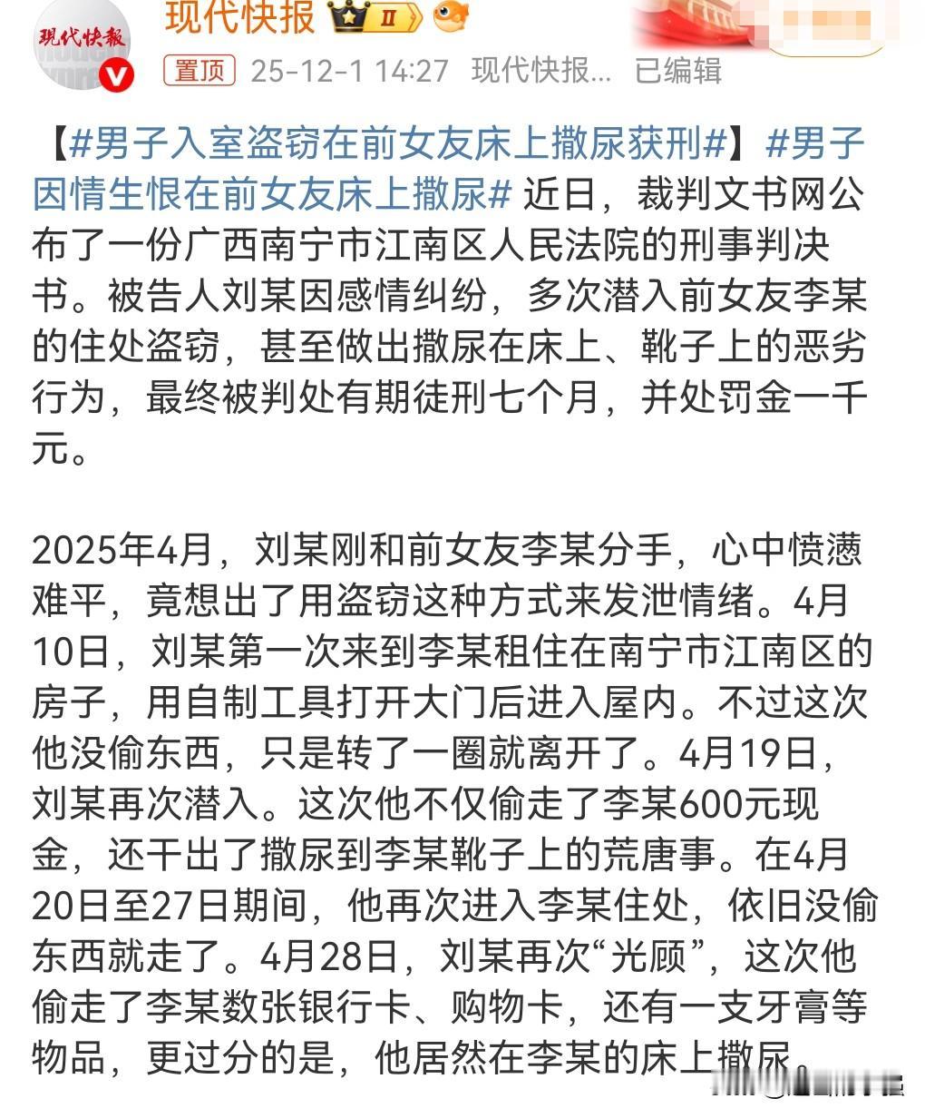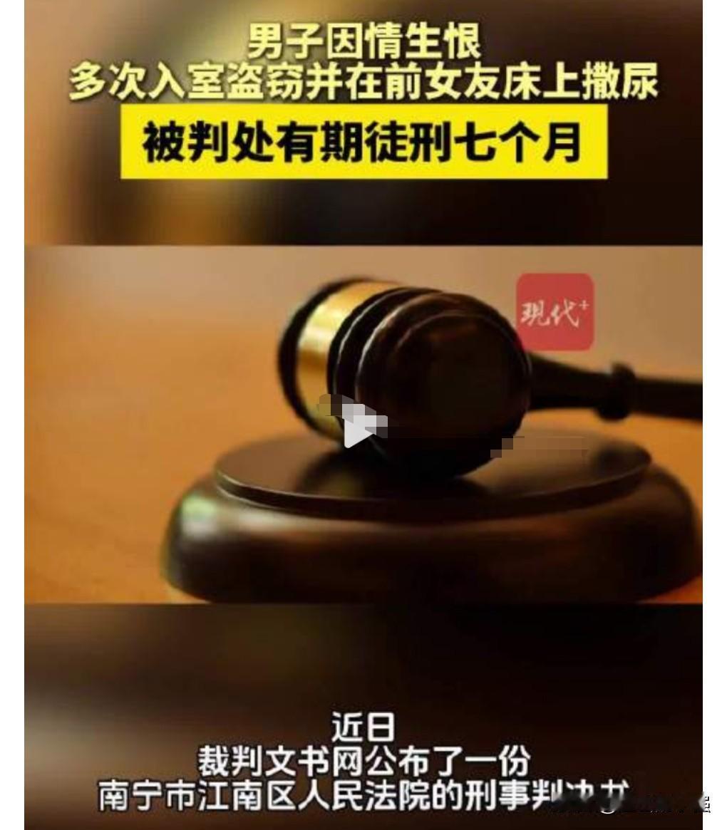 这真的是太恶臭了。 竟然这么对待自己的前女友,典型的因爱生恨啊。 男子入室盗窃在前女友床上撒尿获刑,要坐7个月的牢。 他光偷东西还不够,他竟然还撒尿在床上,看多么的缺德。 男子被抓后,女子选择原谅,但是要求他不可以再跟踪他了。 不过法律面前,还是要对他惩罚,所以判有期徒刑7个月。 既然一段感情无法回头,那还不如选择放下。