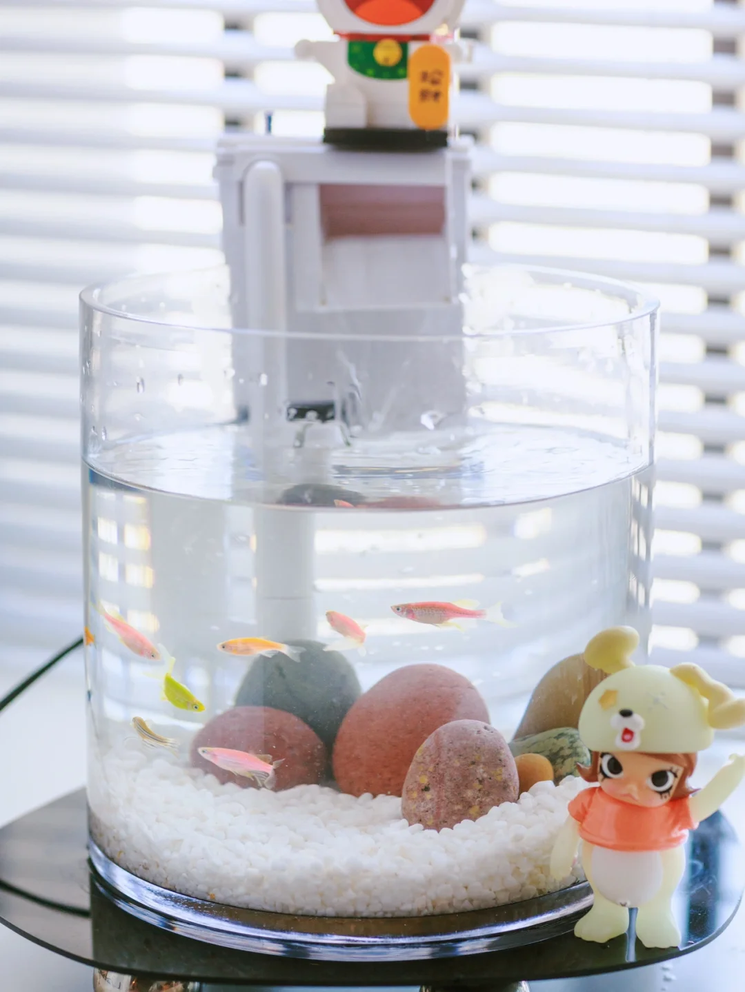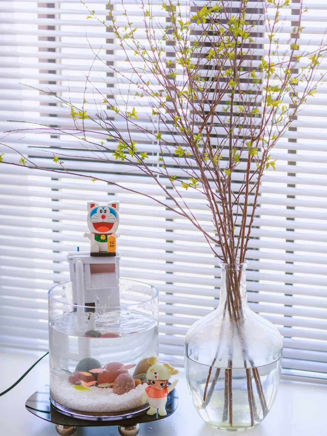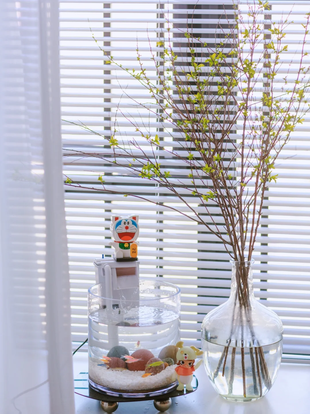 三月春天,天气慢慢好起来。 把鱼缸清洗后,又造了一个简单的景。铺一层白色的底砂,这次用了长江石,五颜六色,遇水后色泽更美丽。清清爽爽太适合春季了。 - 雪柳也发了绿芽,等待开花。 入坑养鱼后,也过了大半年,陆陆续续养过五六种品种。现在鱼缸只剩下斑马鱼,因为生命力顽强,对水循环什么的都无要求,不需要费心。每天起床,给他们喂一次鱼食,每一只都活泼穿梭。春节时回老家,鱼儿们独自呆了半个月没进食,一样健健康康。 - 三月真是一个好时节。