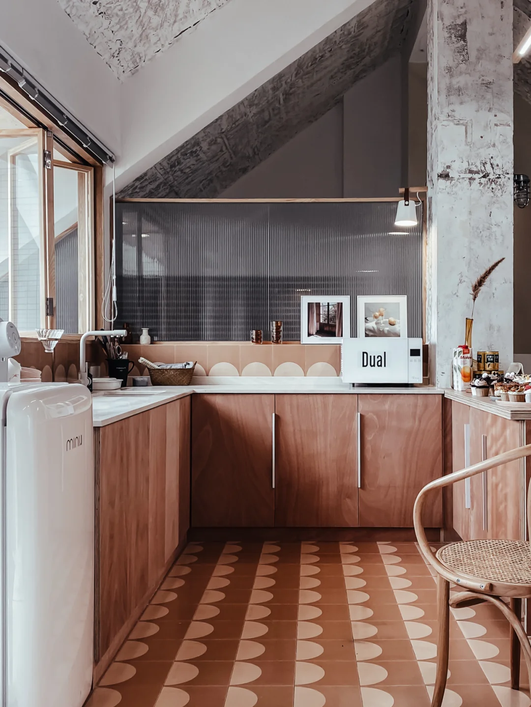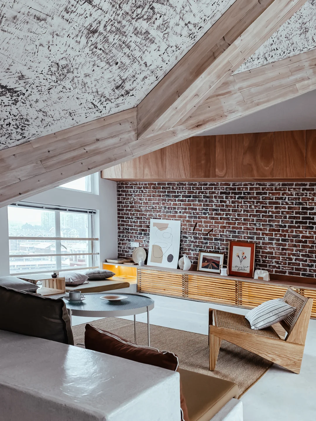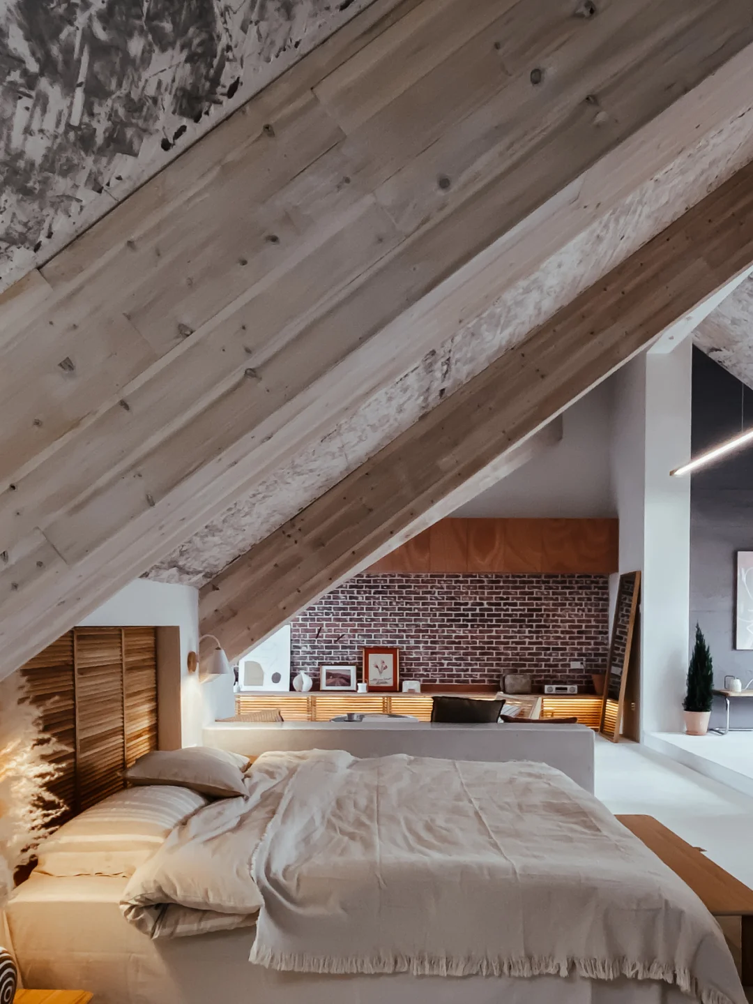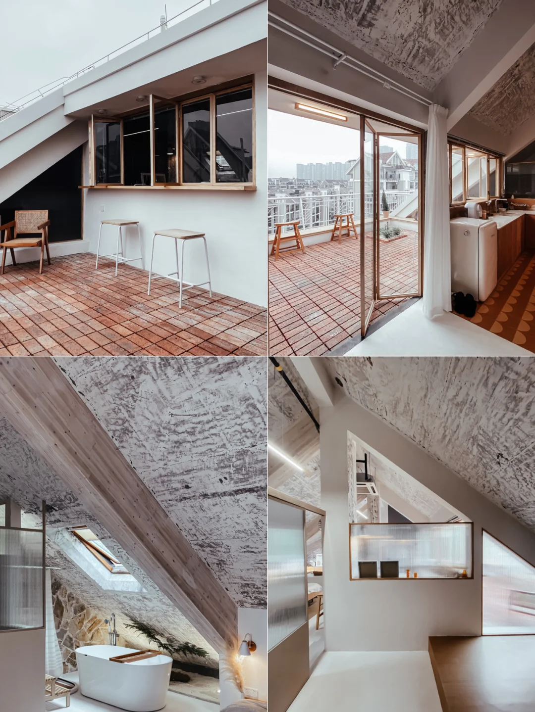 顶楼的民宿住过很多次,但是这种斜屋顶结构还真是头一回体验。100多平的面积,完全开放式格局,通过错落层高与玻璃分割区域,通透又时髦。