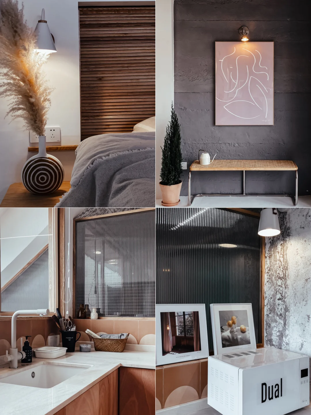 自然剥露的墙壁纹理,搭配木质横梁,融入地坪漆。房东精选的小物件,无处不显示着chic.
