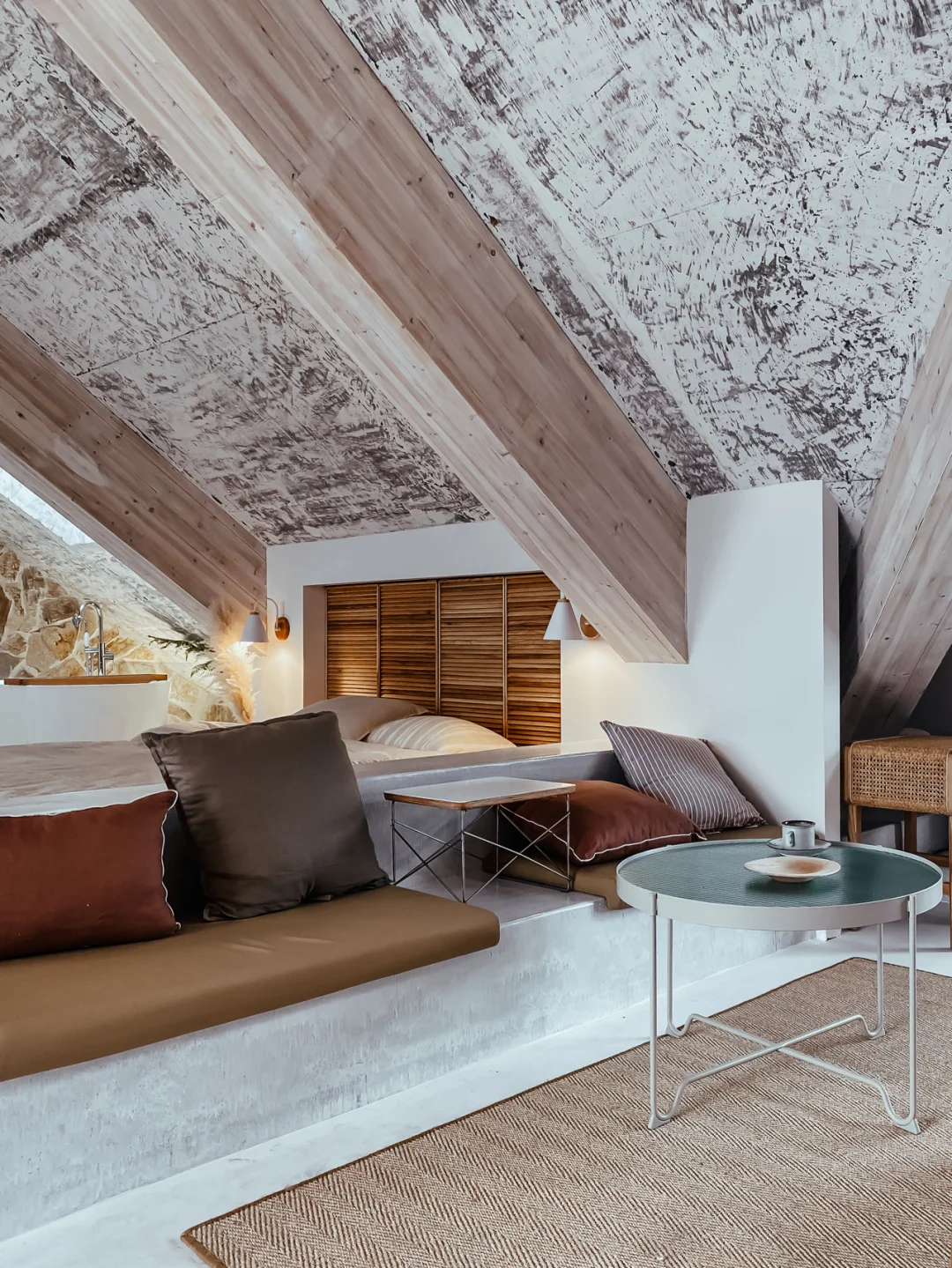 浴缸🛁分离在洗手间之外,斜屋顶开着天窗,月光下会有美好画面🥰。浴缸背后的一株蕨类植物,又给了空间一息生命力。