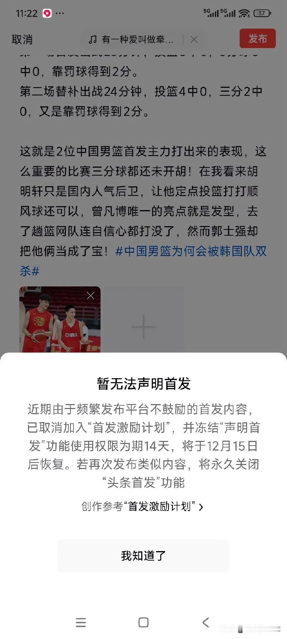 晴天霹雳!一脸懵圈! 本想发个微头条,一看我的首发功能被平台冻结了,冻结周期14天!原因是频繁发布平台不鼓励的首发内容。 我就纳闷了,我最近没怎么发过微头条,即使有也是有感而发的原创,且只有在头条这个平台发布。我是今日头条体育领域的创作者,头条是有权利封禁或者冻结我任何权益和功能,但是宣判前总得给个正当的理由吧? 就这一个通知消息,没有具体的违规原因,我都不知道错在哪里?真的很无语…………