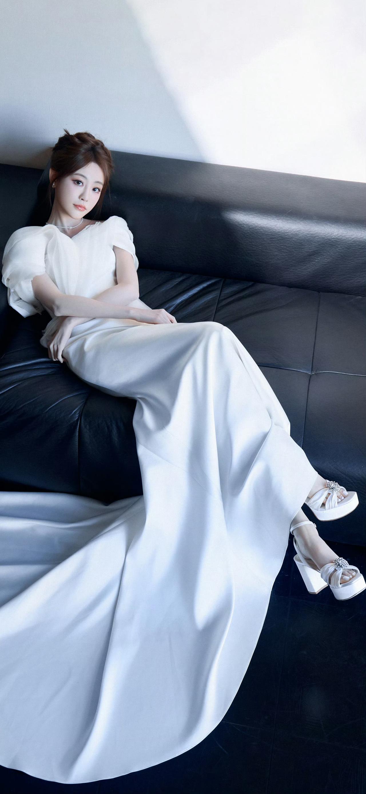 公共场合穿成这样,到底碍着谁了?亮面白裙裹得贴肤,往橘色沙发上一蜷。腿叠腿,裙