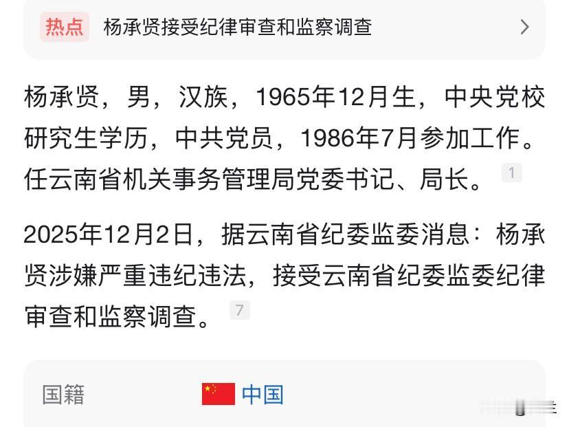 今天云南的杨承贤又上了热搜 他是出生在1965年 从工作起几乎都在云南 曾在教育、医疗等多个行业任过重要职务 凭着优秀的工作能力他曾获得过重要荣誉 他有着近四十年的丰富工作经验 今年刚满60岁的他 过几年就能平稳退休了 就在去年他还在活动上侃侃而谈 大谈“纪律”“职责” 没想到如今自己却上了热搜 这样的反差实在令人唏嘘 也说明了,要是做了不该做的事, 是不会让你平安着陆的!