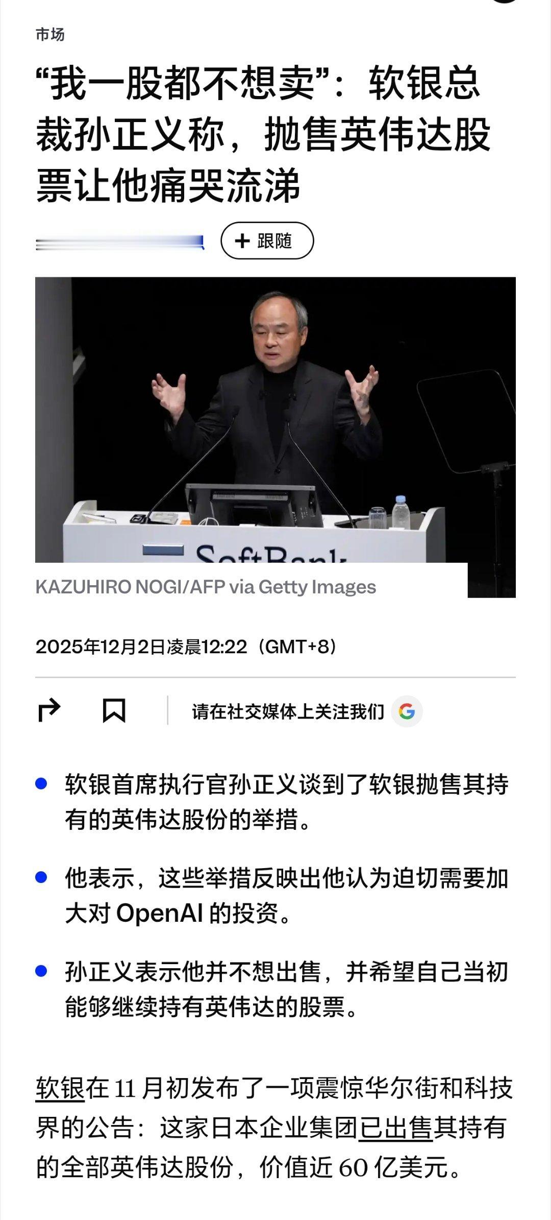 孙正义称哭着卖出英伟达孙正义回应清仓英伟达:为了投AI,我是哭着卖的