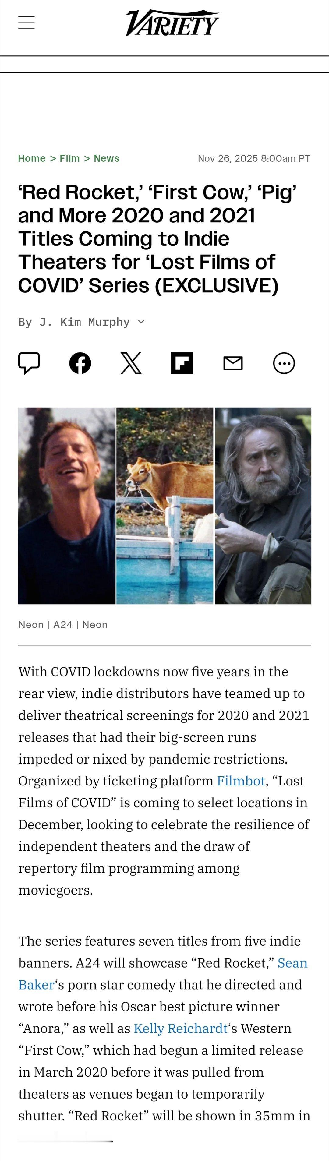 VARIETY综艺官方报道:Filmbot将于12月推出“新冠疫情期间被错过的佳片”系列放映活动,为7部2020至2021年间发行的独立电影补上它们当年错失的大银幕亮相机会。回归的影片包括:· 肖恩·贝克《红色火箭》74届戛纳主竞赛入围(部分影院提供35毫米胶片版本)· 凯莉·莱卡特《第一头牛》70届柏林主竞赛入围· 迈克尔·萨诺斯基《救猪行动》31届哥谭奖最佳影片提名· 本杰明·李《画家与贼》36届圣丹斯入围、64届伦敦电影节最佳纪录片· 汤姆·摩尔/罗斯·斯图尔特《狼行者》78届金球奖最佳动画长片提名· 娜塔莉·埃丽卡·詹姆斯《遗落家族》30届哥谭奖最佳影片提名· 刁亦男《南方车站的聚会》72届戛纳主竞赛入围