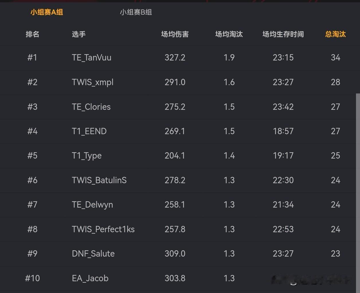 4AM、JDG率先回家! PGC全球总决赛A组小组赛三天比赛结束! TE、TWIS、T1、EA、DNF直接晋级总决赛 17惊险晋级复活赛阶段,4AM、JDG回家了! 最后一把QAD要是努力点,差点把17也送回家,那样三个队伍全走,什么场面不敢想,17惊险晋级后准备复活赛的比赛吧 JDG只能说醒的太晚了,如果再来个一两场,说不定有机会的,但作为赛区一号种子打出这样的表现其实还是低于预期的 4AM平平淡淡过了两天,甚至今天前四场打完都没觉得4AM能淘汰,结果最后关键的两场没拿分,提前结束本次PGC全球总决赛之旅,一年又一年,4AM再也回不到从前!!!