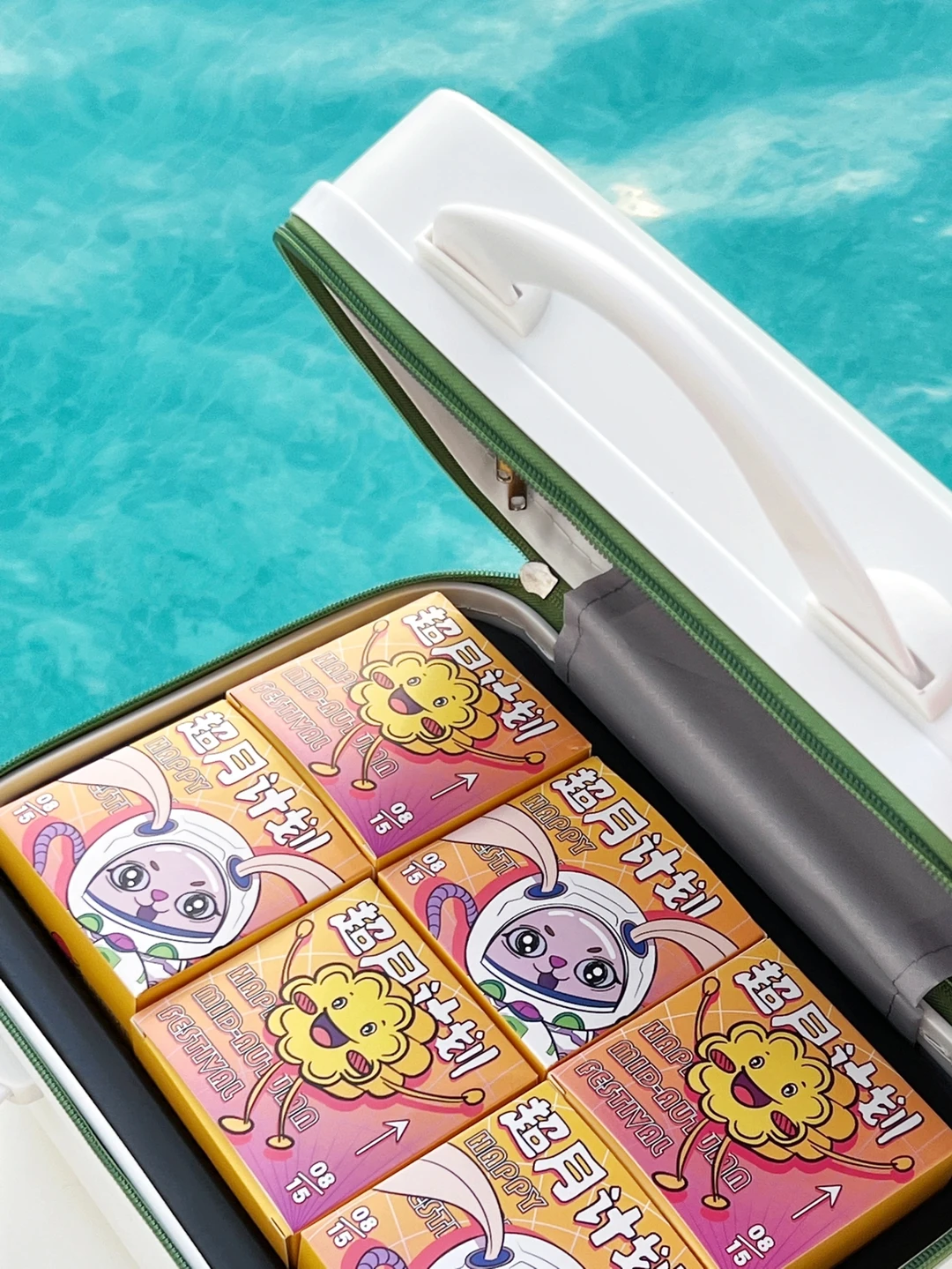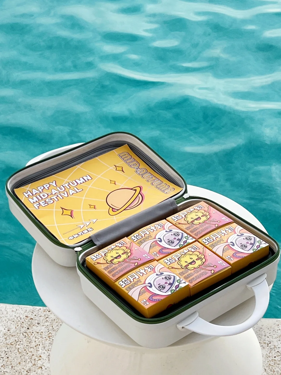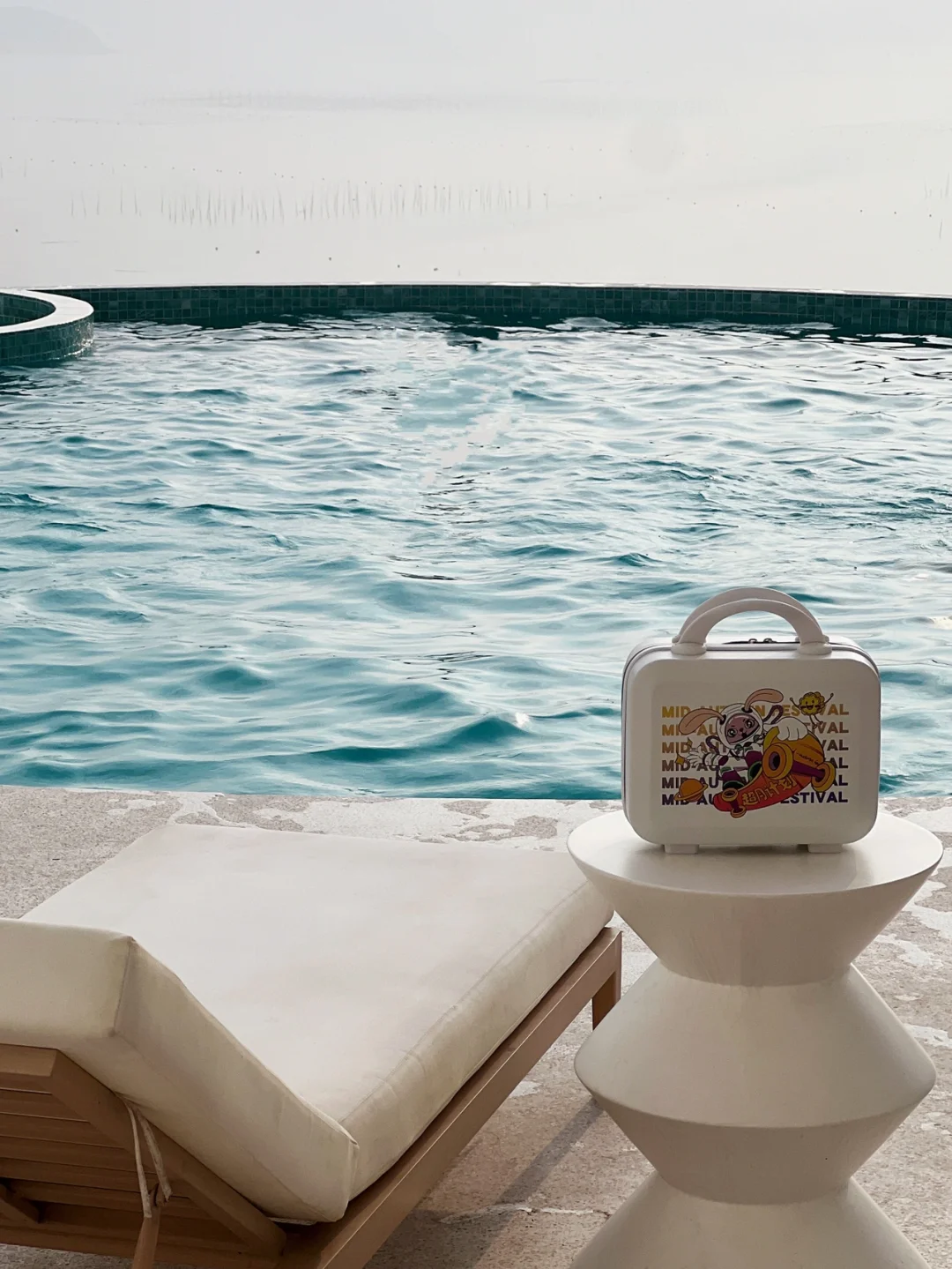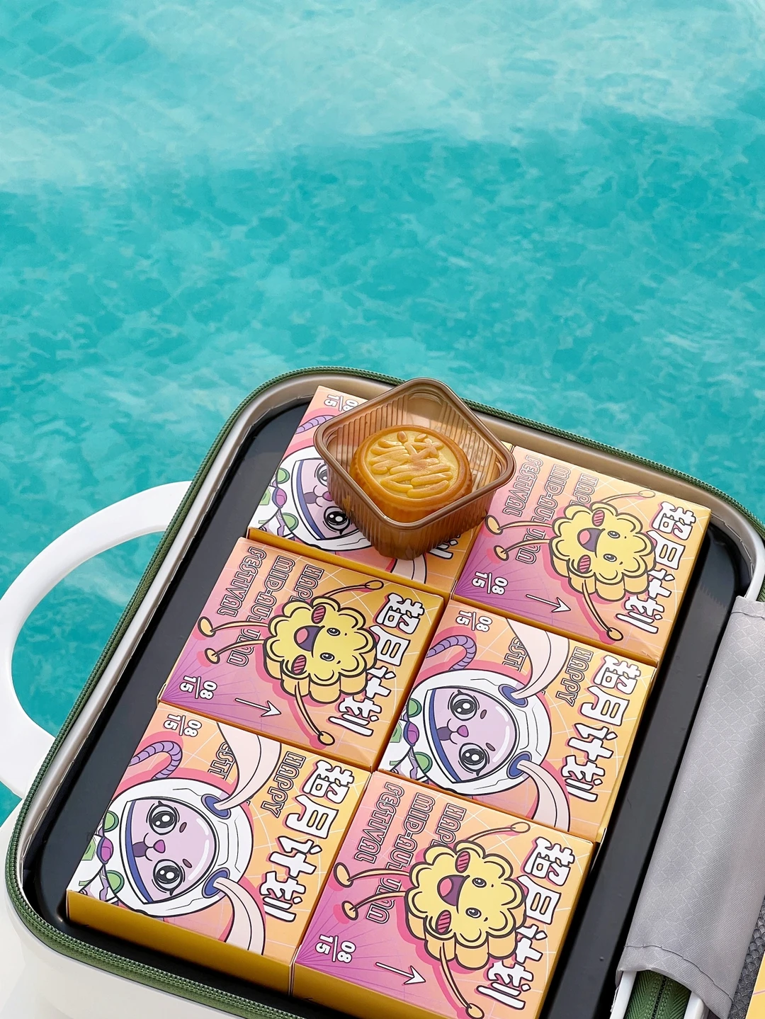 八月初,给自己放松一下。 约朋友一起去海边旅行度个假。 背个包,带两件换洗衣服,提着“超月计划”手提箱出发。 🏊 酒店的露天泳池🏊很美,这个很萌的手提箱其实是送朋友的七夕小礼物。里头是六枚中秋月饼🥮,“奶黄流心、榛仁黑巧克力、莓桃芝芝、海盐芝士抹茶”四种口味。朋友说应该是今年吃的最早的中秋月饼。 🏊 现在礼盒都好内卷~这个14寸的小小旅行箱,很适合放一些个人物品,带有干湿分离层,朋友说正好用来装茶具去露营。 🏊 享受夏天这一刻。