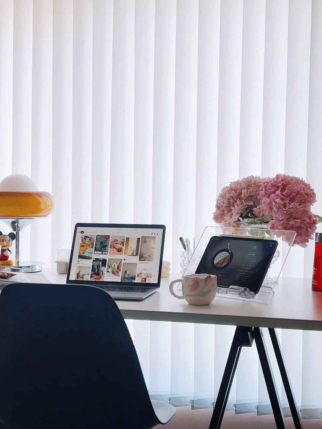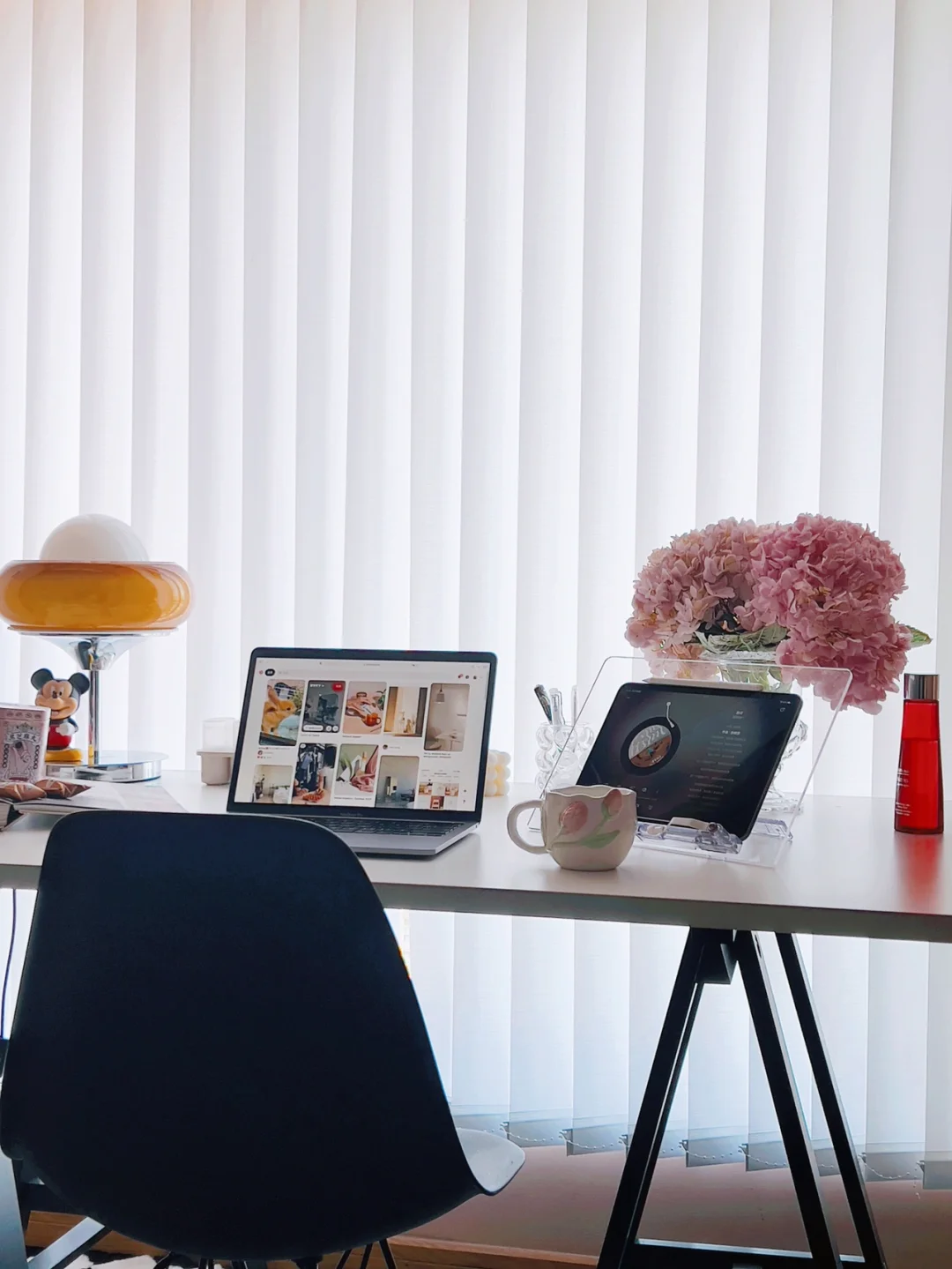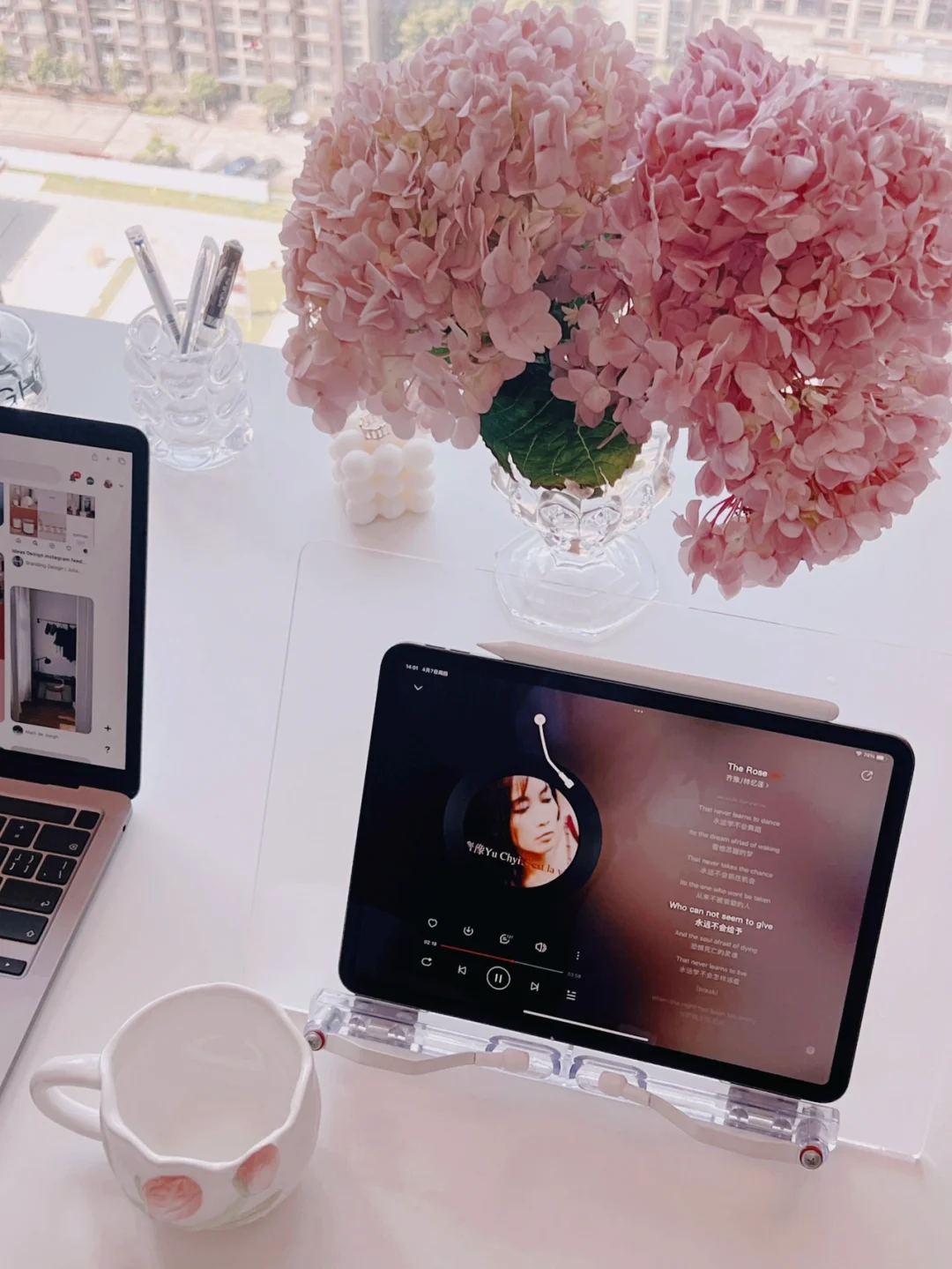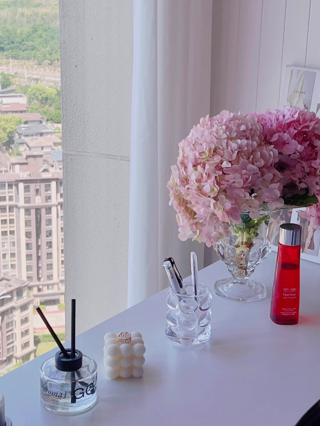 书桌上放一束鲜花是个人喜好。今天是粉色绣球,鲜花能让人心情愉悦。