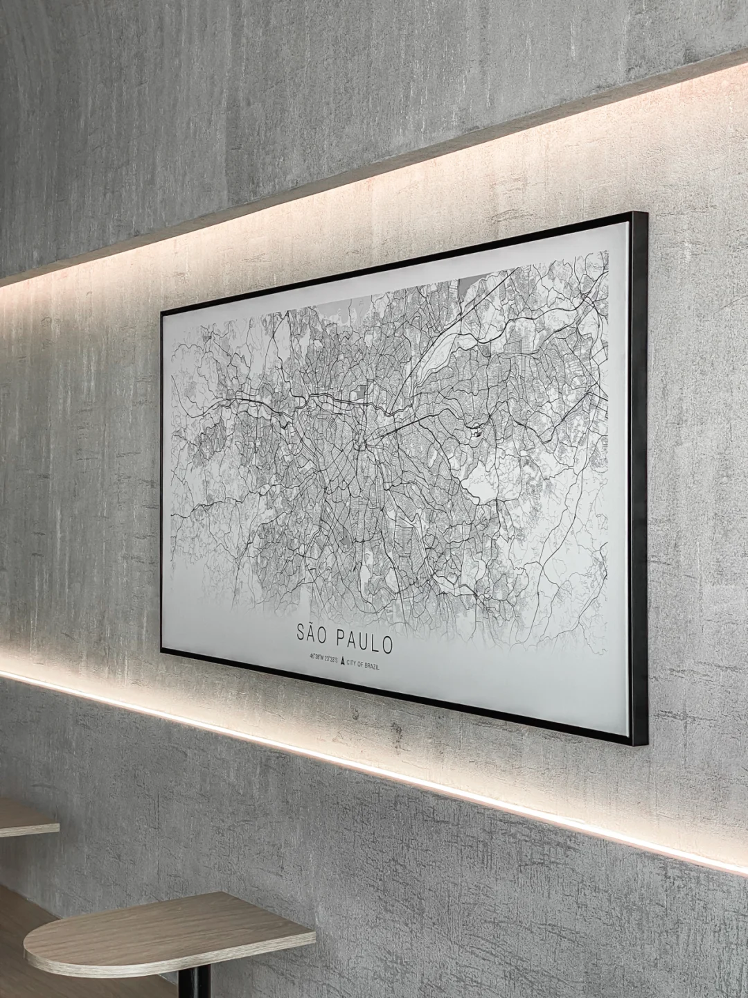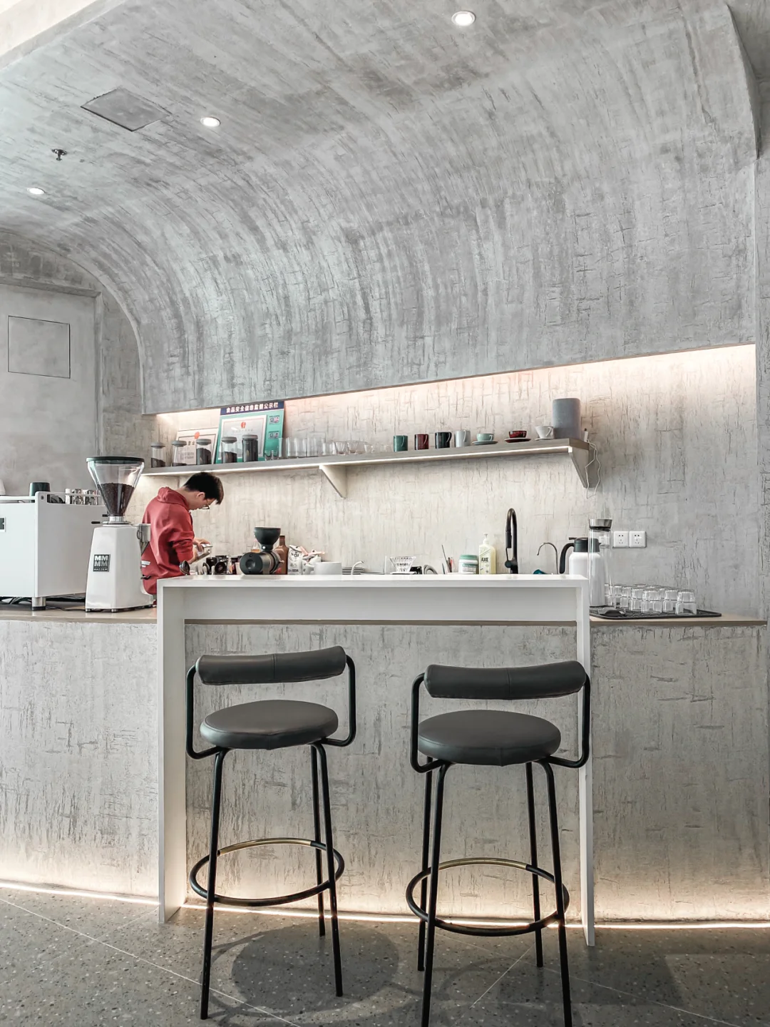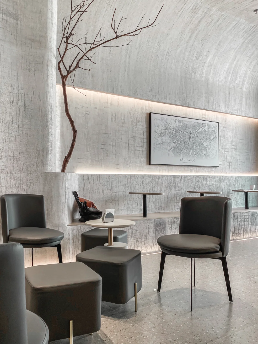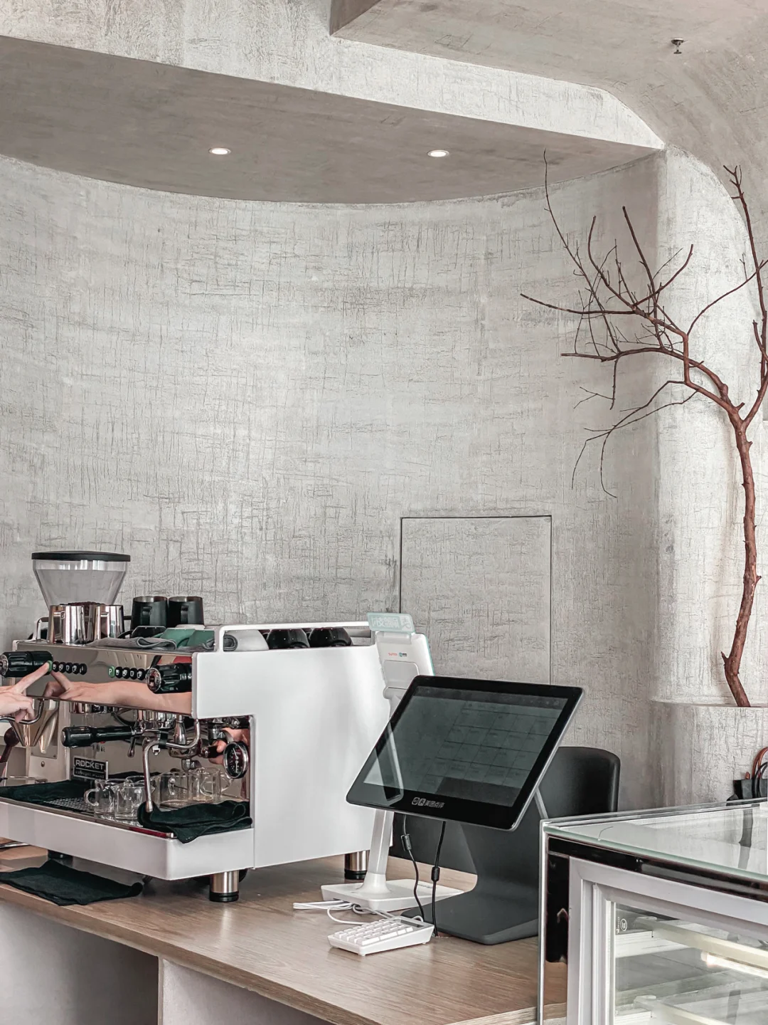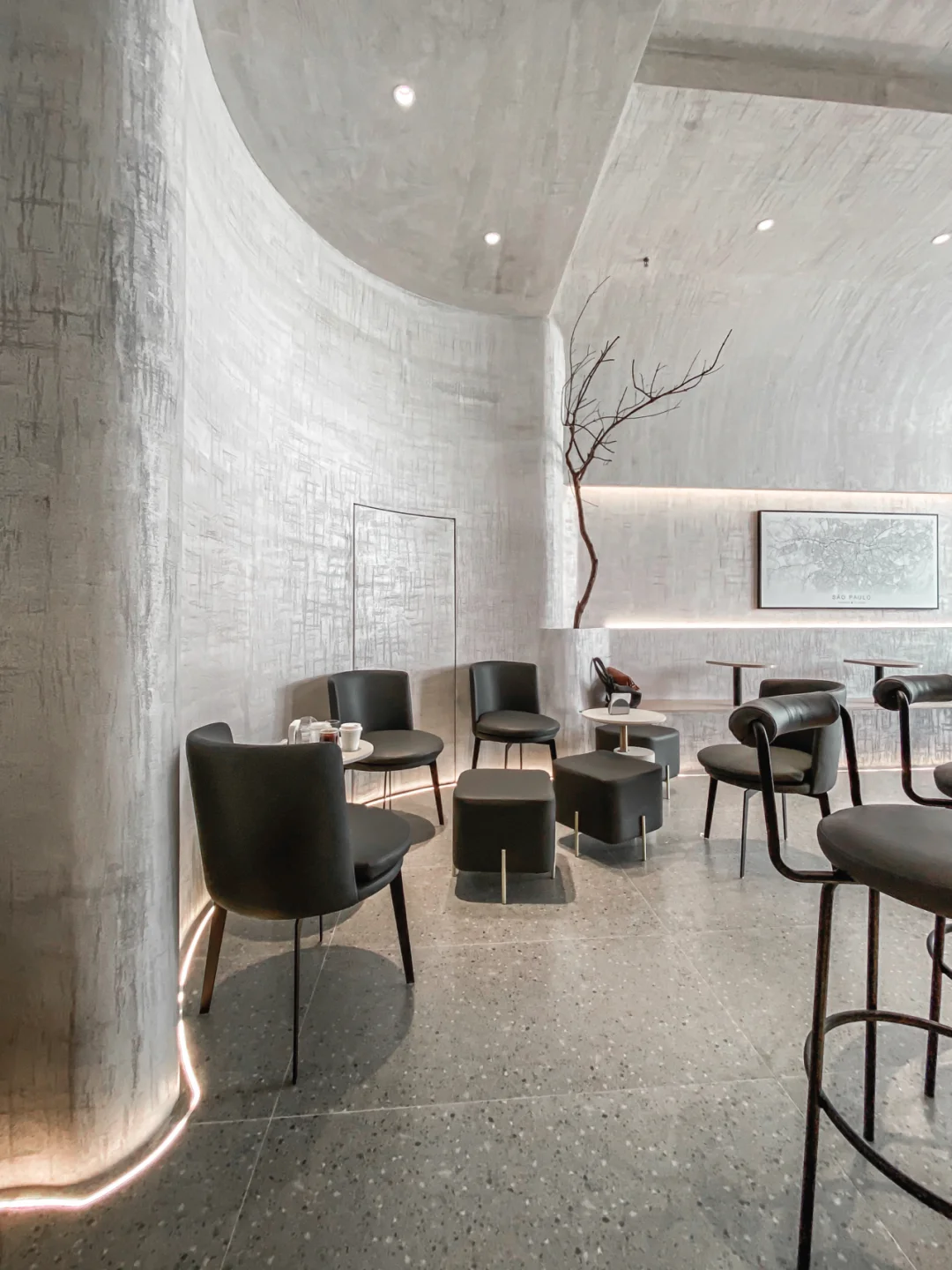 微水泥工艺的室内,简约干净。悬挂着孤独感的树枝据说是老板从鼓山拾回来,瞬间与整体环境冲撞成了艺术装置。