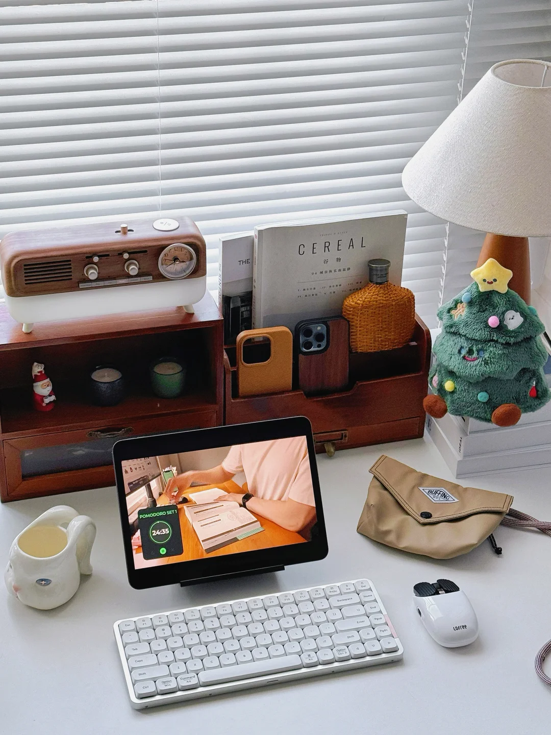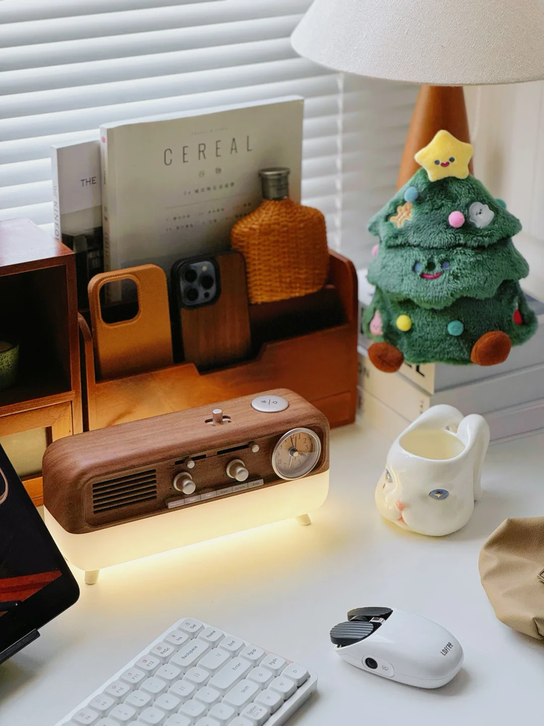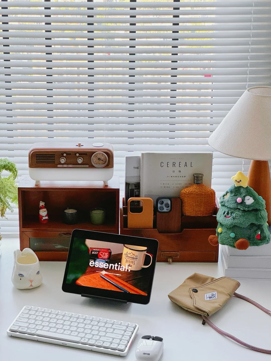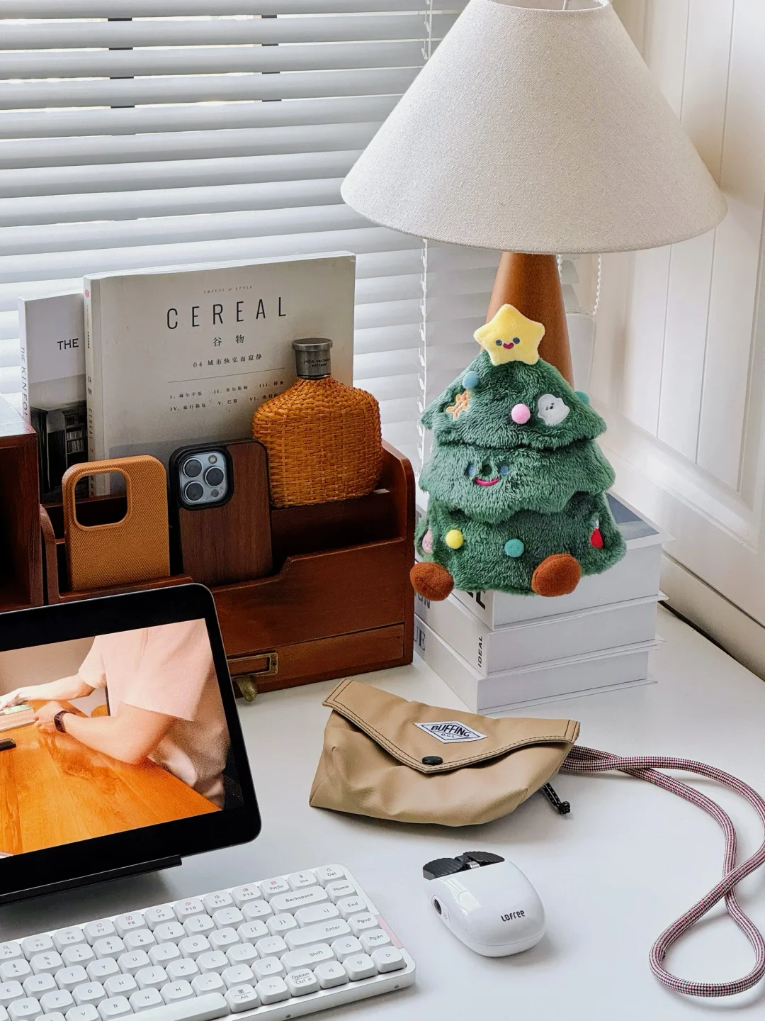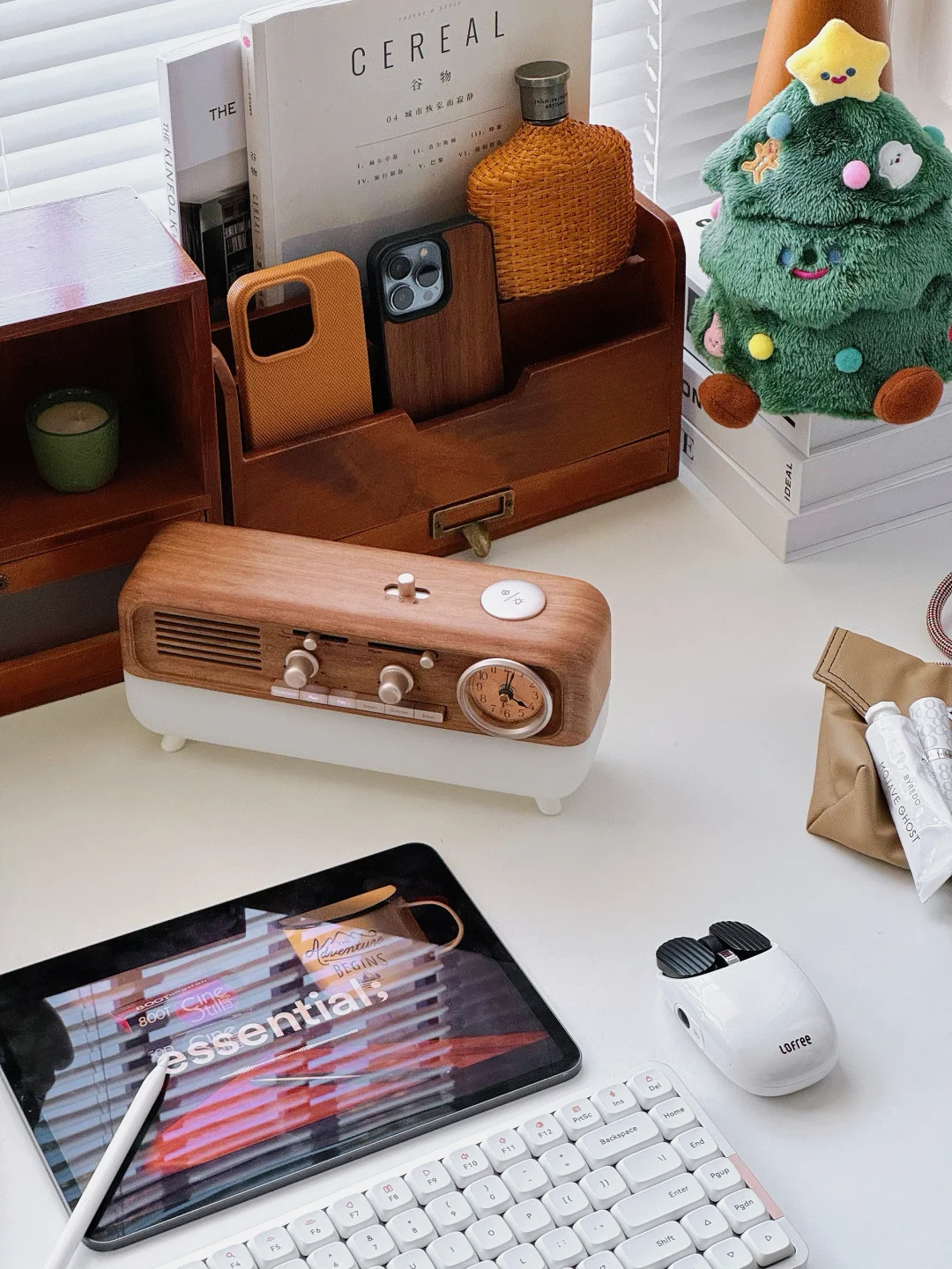 今日份书桌日常分享 其实木质和白色书桌搭配也可以很ins 平时一般都是很极简风的白色桌搭 今天加入了木质搭配居然也是很养眼! . 两个木质收纳盒 可以收纳桌面一些小东西和杂志文具 并排放着就有一种古着zakka风 再摆上原木色蓝牙音箱 氛围感就拉满啦! . 圣诞季的书桌也是要一棵可爱的圣诞树🎄 下午坐在书桌前办公 会把音箱开启白噪音~喜欢溪流声 很享受这样的宅家工作状态 . 书桌一直是家里Z喜欢的角落。
