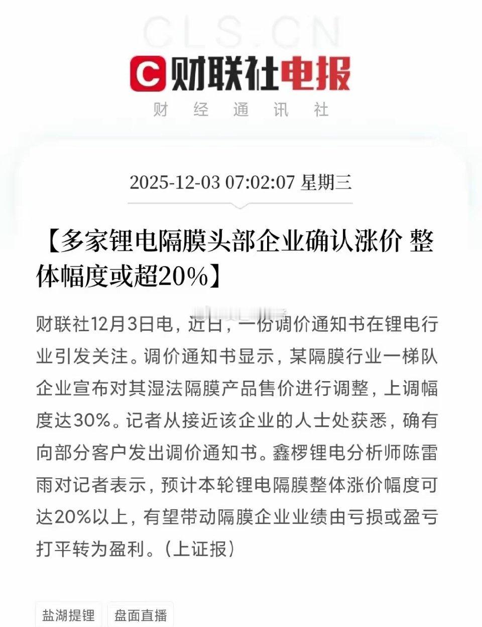 突发!锂电隔膜再掀涨价潮,30%提价+供需逆转,新能源产业链迎业绩修复契机满仓新能源的朋友注意了!行业传来重磅利好——锂电隔膜价格正迎来强势上涨行情,头部企业已率先打响提价第一枪!据财联社消息,锂电隔膜行业头部企业近日正式发布调价通知,湿法隔膜产品售价上调幅度达30%。业内分析预测,本轮行业整体涨价幅度有望超20%,这一举措将直接改善相关企业盈利水平,部分企业甚至有望实现业绩扭亏为盈。涨价背后,是供需格局的实质性逆转。年末新能源汽车抢装潮叠加储能项目集中落地,锂电池产业链景气度快速回暖,隔膜需求持续激增;而作为技术壁垒高、扩产周期长的核心环节,隔膜行业产能释放速度难以匹配需求增长,当前产能利用率正持续攀升。值得关注的是,这已是近期行业第二轮集体提价,标志着持续数年的“价格内卷”正式迎来拐点,行业盈利水平有望进入修复通道。对于拥有规模优势与技术壁垒的头部企业而言,此次涨价红利有望充分释放,业绩弹性值得期待。相关核心标的梳理如下:- 恩捷股份:湿法隔膜绝对龙头,市场份额稳居行业前列,议价能力突出;- 星源材质:湿法隔膜技术标杆,与恩捷股份并称“湿法双雄”,产品竞争力强劲;- 中材科技:央企背景加持,隔膜业务处于快速放量期,增长潜力显著;- 璞泰来:深度布局隔膜涂覆领域,具备一体化产业链优势,盈利稳定性更强。