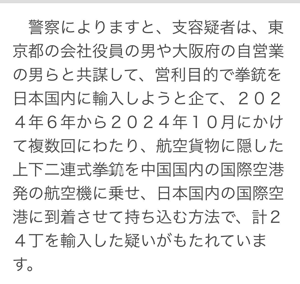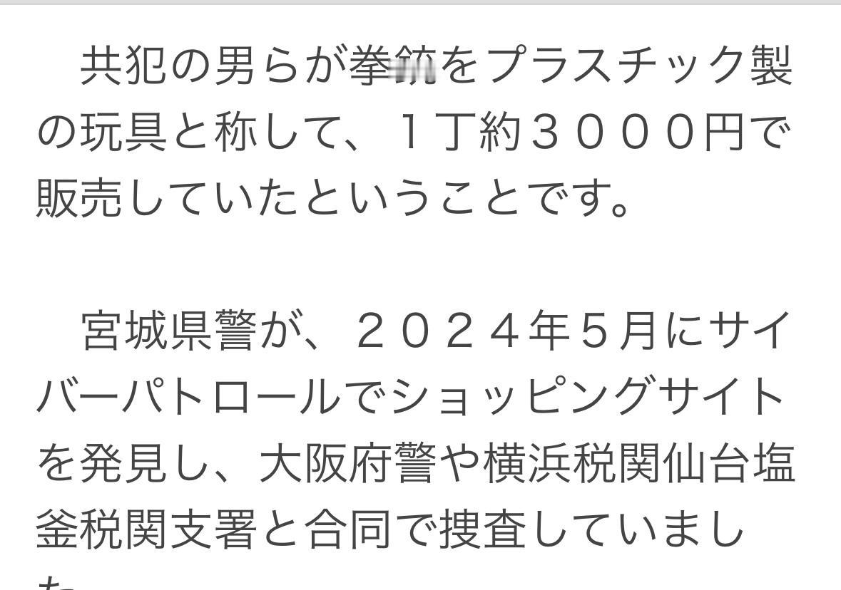 一名46岁的中国男子因涉嫌从中国向日本走私24支手枪而被捕。 支某与一名东京公司高管和一名大阪个体户合谋,以牟利为目的,多次走私手枪进入日本。2024年6月~10月期间,将双管手枪藏匿于航空货运行李中,从中国起飞抵达日本,共计走私了24支手枪。 他们将这些手枪伪装成塑料玩具出售,每支售价约3000日元。警察在网络巡逻中发现了该购物网站。