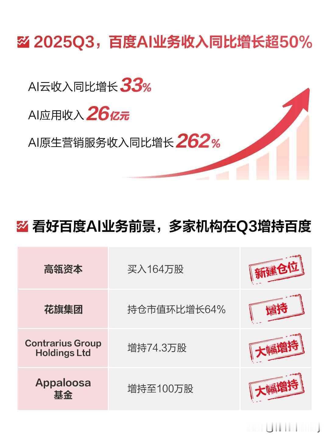 聚焦AI提升效能,百度这波发力了! 最近关于百度对AI核心组织架构的调整得到外界关注。模型研发部和应用模型研发部两大核心部门,直接向CEO汇报。作为百度近年来的核心方向,此次组织架构调整远非简单的业务优化,而是百度为迎接全面AI时代所作的系统性、根本性变革。新成立两大专注于不同维度的大模型研发部门,这也体现了百度对AI产业发展规律的深刻洞察。 事实上,这次调整包含了百度对AI行业变化的深刻洞察。有行业人士认为,此次调整实际代表了百度正在从“用AI优化业务”向“为AI时代重构组织”深度转型。在AI技术日益成熟的当下,单一的技术优势已不足以构建持续竞争力,而组织的适配性成为决定AI战略成败的关键因素。此次调整是百度为迎接AI时代到来,进行的系统性、根本性变革。” 据悉,新成立的基础模型研发部将专注于研发高智能、可扩展的通用人工智能大模型,这也是百度在AI基础理论研究上的长期主义体验。该部门将致力于突破大模型的技术瓶颈,在模型架构、训练方法、推理效率等关键领域实现创新。 而与基础研发形成战略呼应的是应用模型研发部,或将更专注于业务应用场景的模型调优和探索。同时形成更加明确的“双轮效应”。通过将基础模型的能力高效转化为实际的业务价值,这一过程需要深刻理解各垂直行业的痛点,并针对特定场景进行精细化模型优化。推进模型的专业化调优,使通用大模型能够适应金融、医疗、教育等不同领域的特殊需求;降低模型使用门槛,通过工具链和平台的完善,让业务部门能够便捷地调用AI能力;建立科学的効果评估体系,确保AI应用能够产生可衡量的商业价值。 从产业竞争视角看,此次组织调整进一步巩固了百度在AI领域的领先地位。通过专业化分工和资源聚焦,百度在基础模型和应用模型两个层面都增强了竞争力。特别是在大模型研发方面,专业化部门的设立有望加速技术迭代,提升百度在国际AI格局中的位置。近期,多家投资机构的三季度美股持仓报告(13F)已陆续披露,高瓴、花旗、Appaloosa均重仓百度。据披露,三季度高瓴新建仓百度,买入164万股,持仓市值超过2.1亿美元,直接跻身第六大重仓;花旗集团持有35万股百度,持仓股数和持仓市值分别环比增长6.75%、64%。市场分析认为,机构的增持行动或与百度核心业务的强劲表现及AI商业化加速有关。 随着AI技术的不断成熟和应用场景的持续拓展,百度此次组织重构的长期价值将逐渐显现。这不仅关系到百度自身的未来发展,也将对整个中国AI产业的演进产生深远影响。在AI这个充满机遇和挑战的新战场上,组织进化正成为比技术创新更具决定性意义的关键变量。