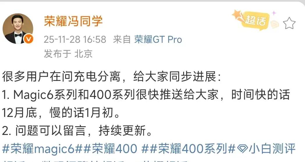 🔥荣耀疯抢好感!Magic6/400系列充电分离功能速来✅ 最快12月底推送,最晚明年1月初安排,游戏党直接狂喜到跺脚~🥳 这功能香到离谱!说人话: 玩游戏插电=电力直供手机,不折腾电池! 机身发热秒降💨,电池寿命锁死,边充边玩再也不心疼~ 还能自定义电量阈值(比如70%),低于才充电,细节拉满! 之前GT Pro专属黑科技,现在下放主力机,荣耀这波太懂用户了~ 后续Magic5系列也跟上,实用功能要普及全机型啦!