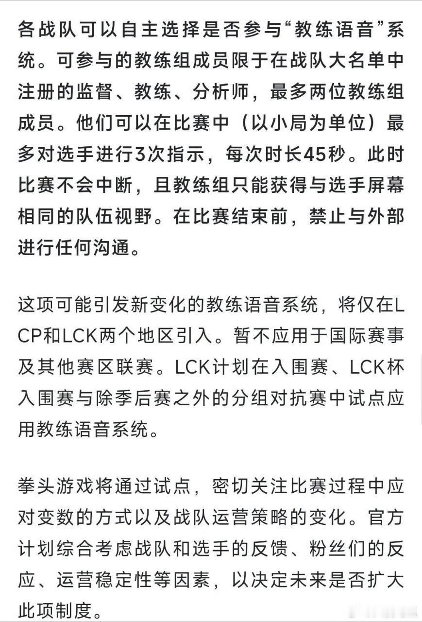 瓜友速报 LCK引入教练语音机制,每局3次,每次45秒(教练可以在每一小局最多对选手进行3次指示,每次时长45秒。此时比赛不会中断,且教练组只能获得与选手屏幕相同的队伍视野。在比赛结束前,禁止与外部进行任何沟通。)