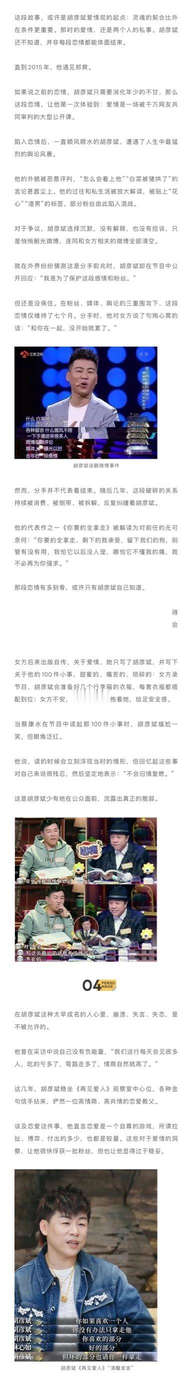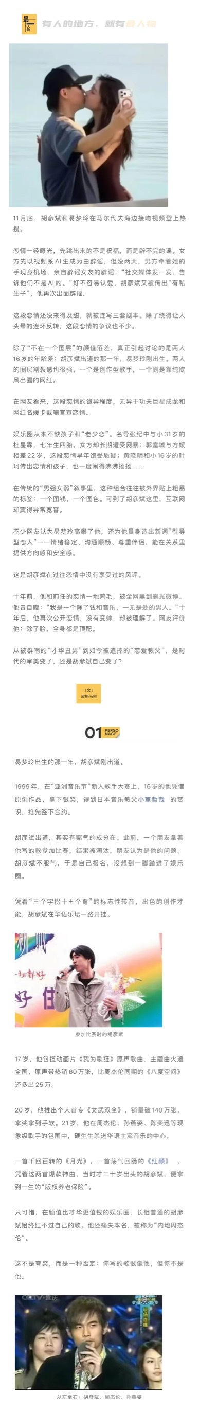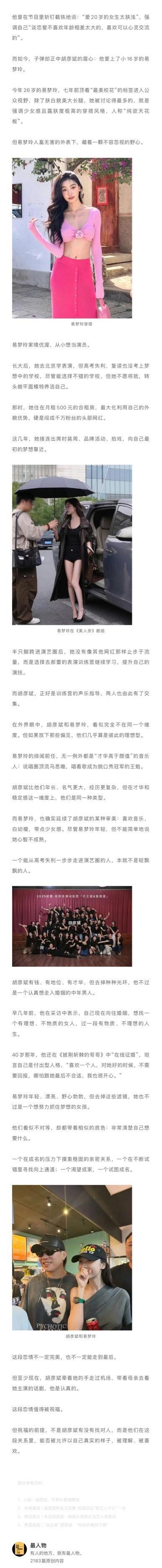 在传统的“男强女弱”叙事里,“老少恋”这种组合往往被外界贴上粗暴的标签:一个图钱,一个图色。可到了胡彦斌 这里,互联网却变得异常宽容。 不少网友认为易梦玲 高攀了他,还为他量身造出新词“引导型恋人”——情绪稳定、沟通顺畅、尊重伴侣,能在关系里提供方向感和安全感。 这是胡彦斌在过往恋情中没有享受过的风评。 从被群嘲的“才华丑男”到如今被追捧的“恋爱教父”,是时代的审美变了,还是胡彦斌自己变了?