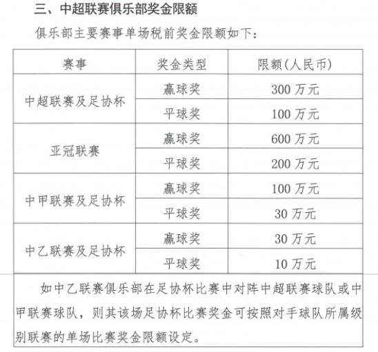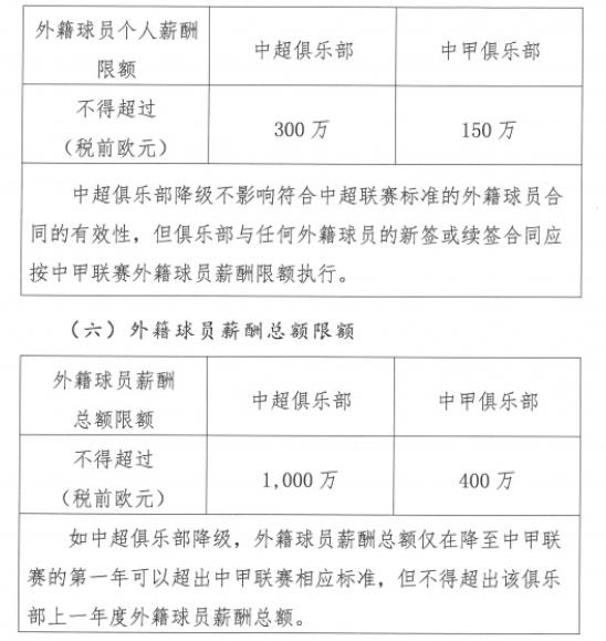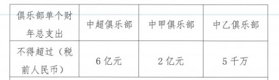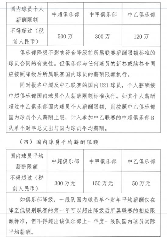 中超限薪令,限投令再出:国内球员最高年薪500万,外援最高300万欧,年总投资不超过6亿。 平地惊雷!中足联突然祭出限薪令+限投令,对三级联赛(中超+中甲+中乙)做出硬性规定,包括球员年薪,奖金,以及俱乐部的投入水平都做了限制。 其中,中超的国内球员的最高年薪为500万人民币(税前),中甲最高是300万税前,中乙是120万税前。每支中超球队的平均年薪不超过300万,中甲是150万,中乙是50万。 外援方面中超是最高300万欧年薪,中甲是150万欧元税前。 也就是等于只有少数主力球员能拿到顶薪。 球队的单场税前奖金限制为:中超从100万到600万之间,其中国内赛事是100-300万,亚冠是200-600万。中甲球队是30-100万,中乙是10-30万。 另外,每年俱乐部的总投入不得超过:中超6亿,中甲2亿,中乙5000万。 从这个限薪令来看,好像跟几年前的版本没有大的区别。