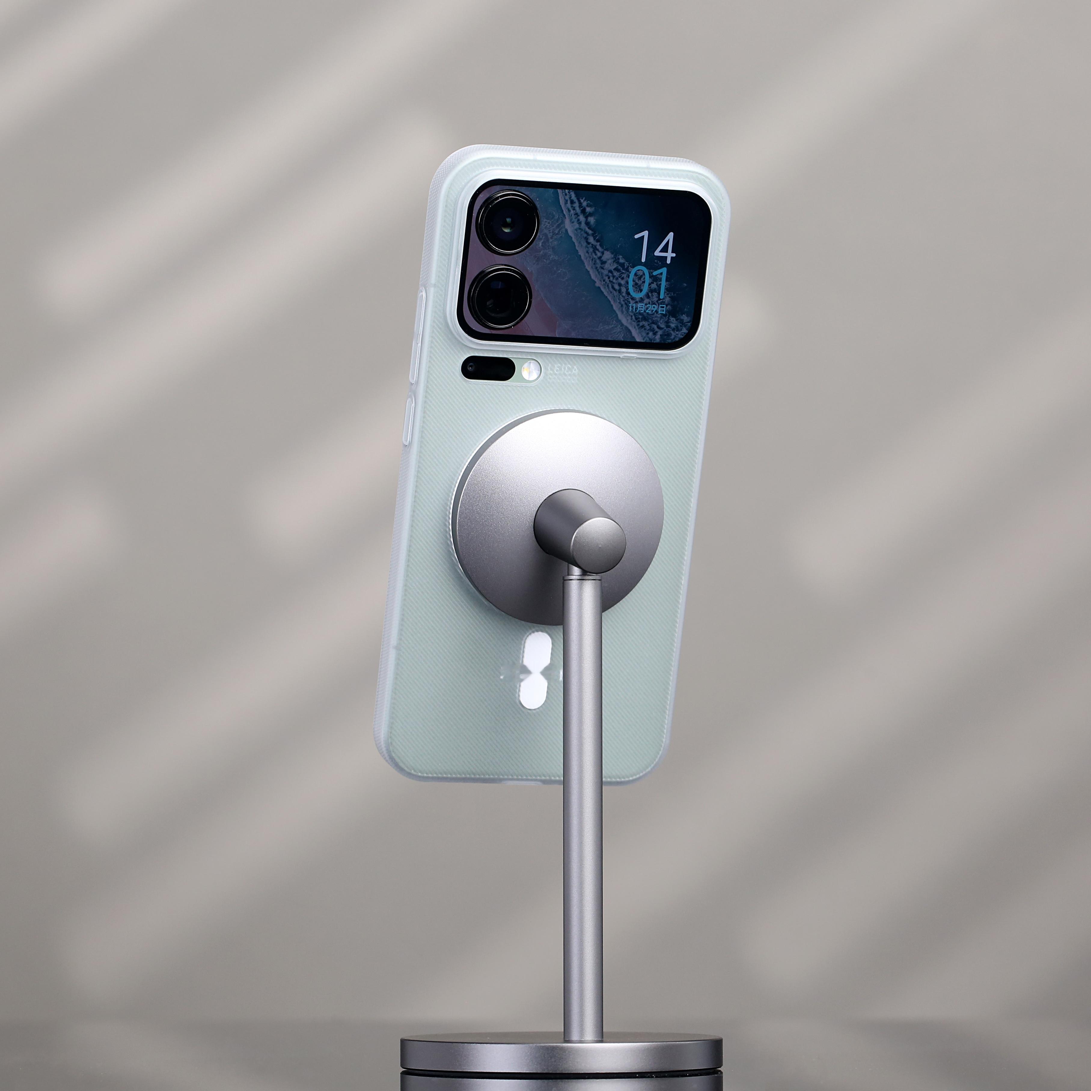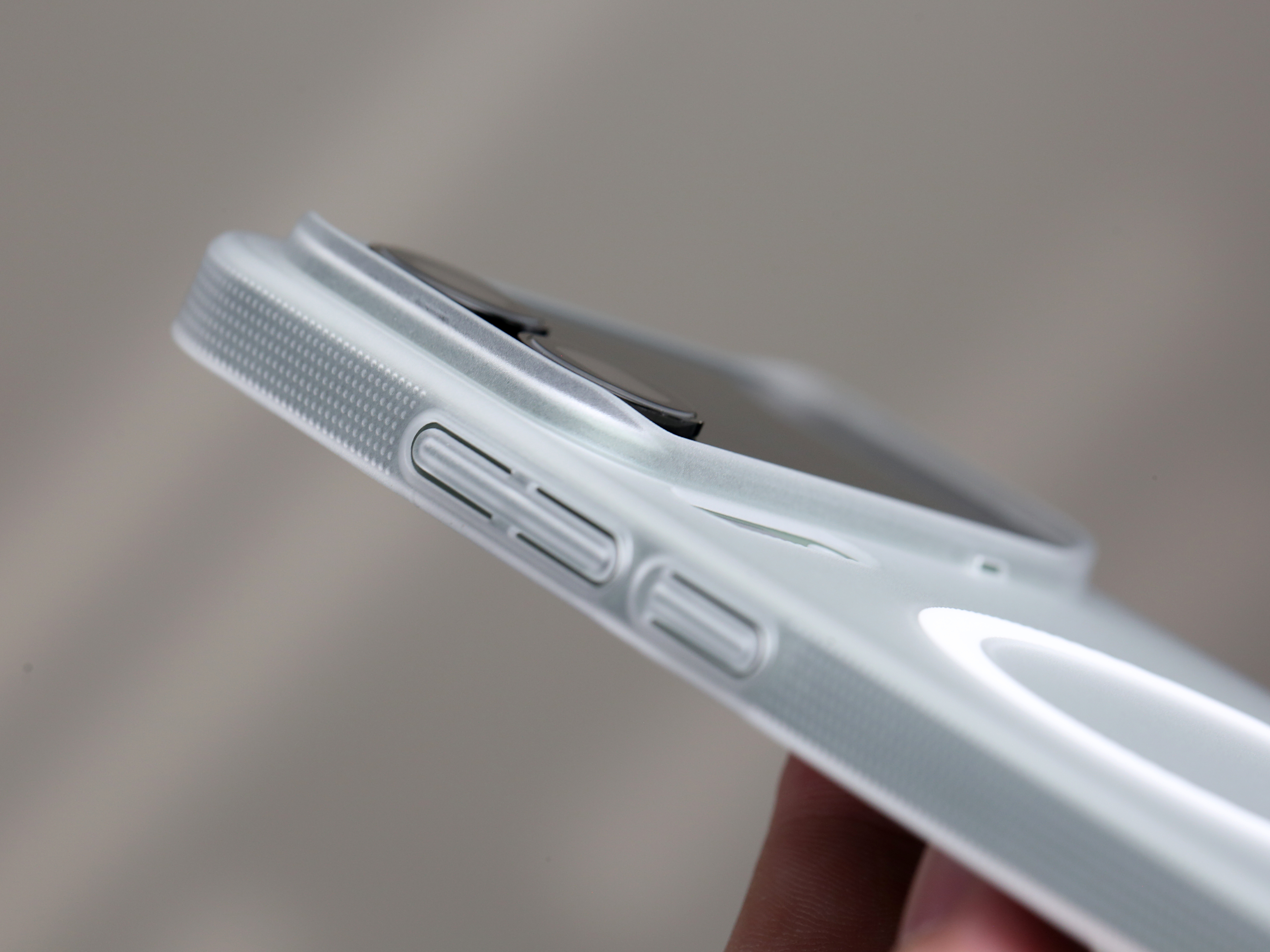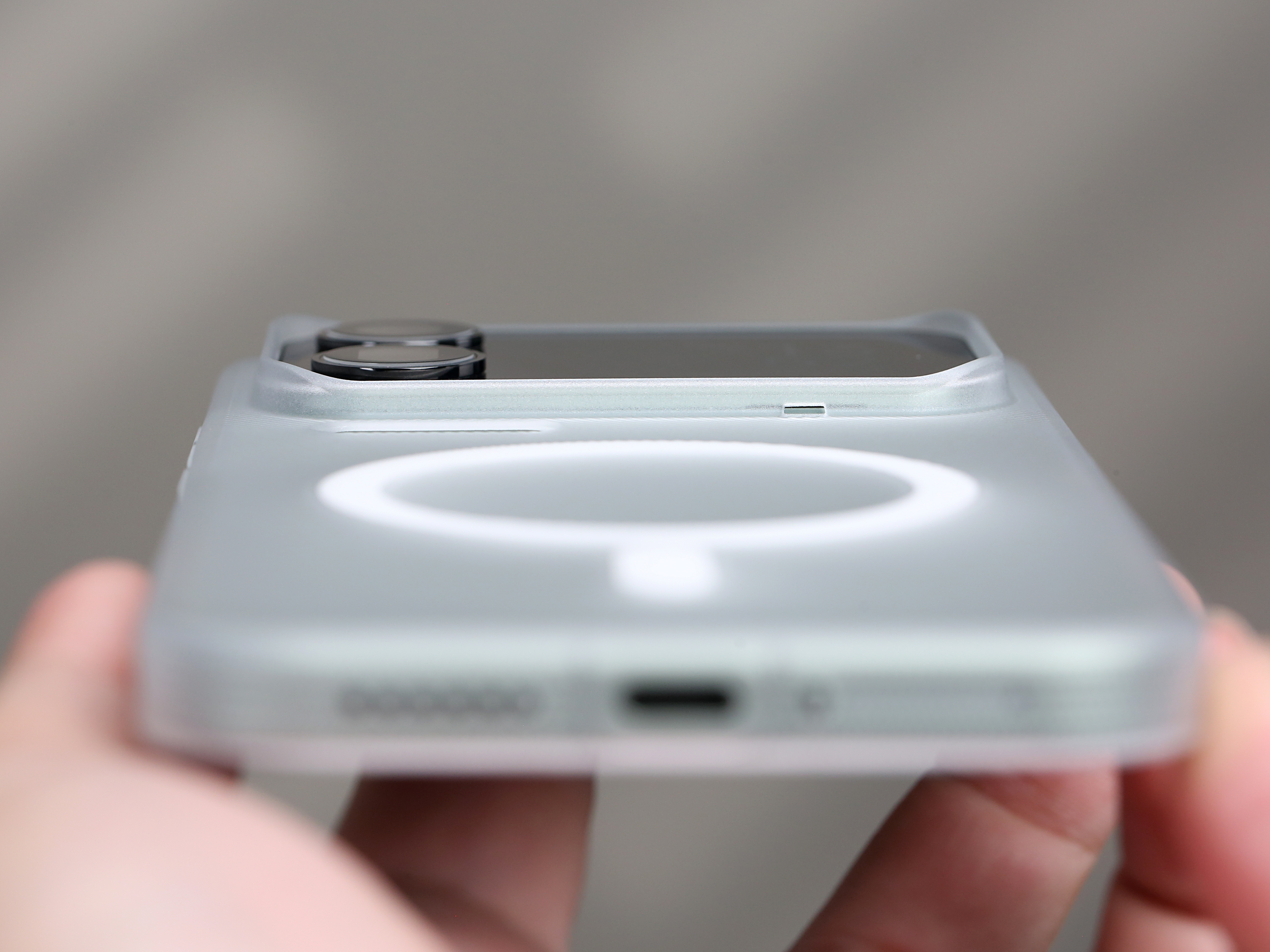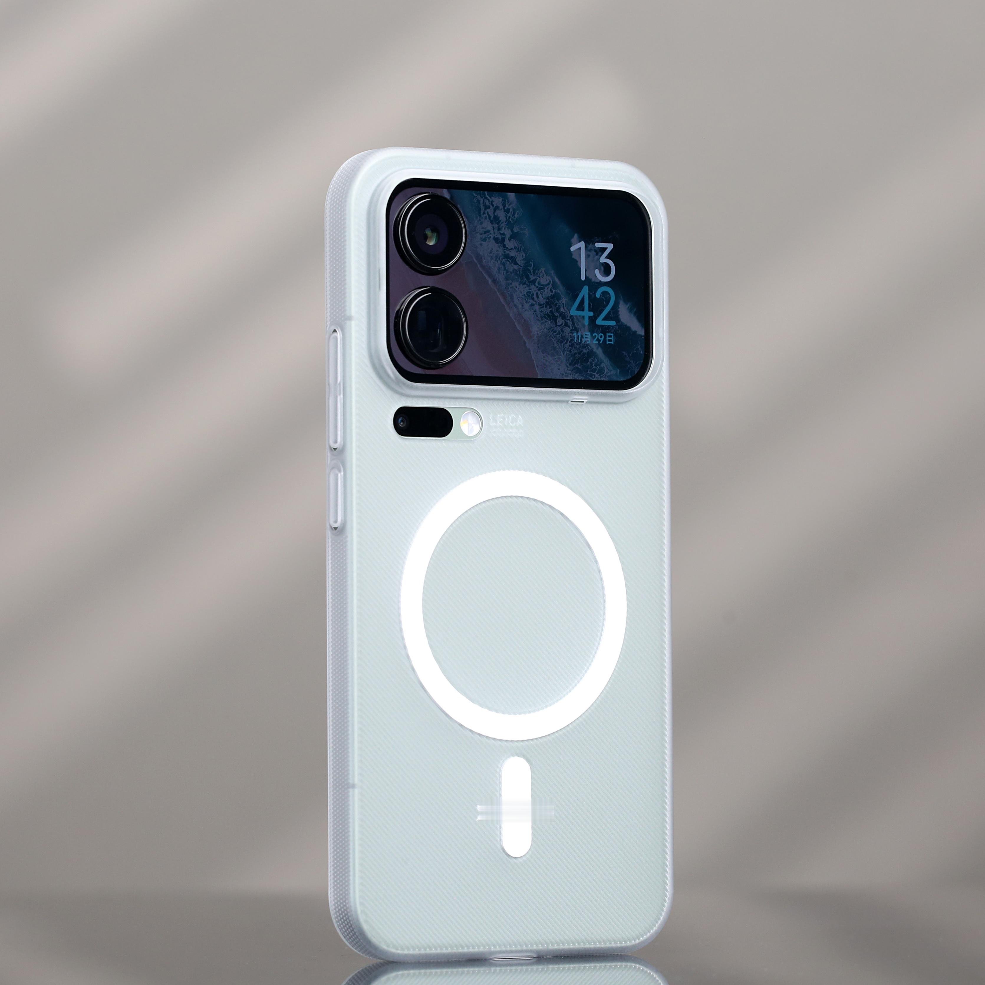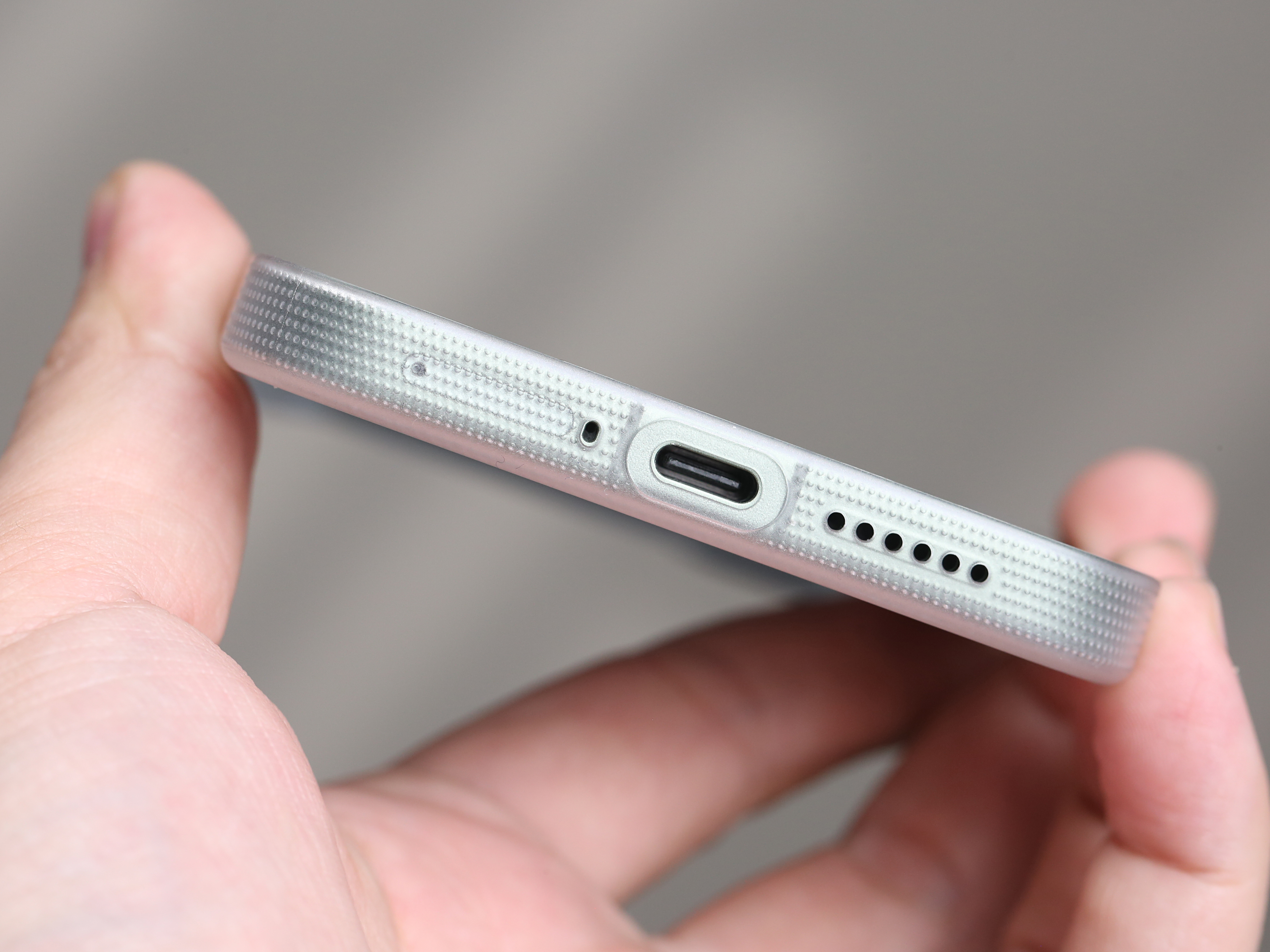 朋友们,小米 17ProMax PC 斜隐上了边框薄约 0.7mm,背板薄约 0.9-1.1mm,磁吸款轻约 16.8g,轻薄感依旧在线。背面高出摄像头防护,同时不挡广角,且兼容绝大部分背屏膜。正面克制高出屏幕约 0.5mm,贴了店里丝印 AR 后基本齐平,手势操作依旧顺畅。可选磁吸款,自带尾巴磁铁,磁圈表面纯平无凸起,搭配 MagSafe 磁吸配件,吸附稳稳当当。底部依旧是熟悉的精孔设计,充电口区域也是防刮精孔设计,兼容出厂自带的充电线,实用好看有效防护。*磁吸款没有按照官方磁吸壳标准设计,不兼容官方无线快充底座,不同款式的无线充电器/磁吸移动电源,也可能存在不兼容的情况**第三方充电线比较宽/金属插口短的话可能连接会不紧密