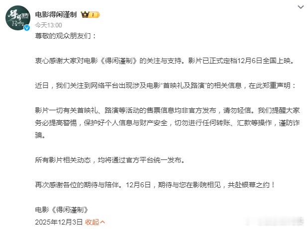 电影得闲谨制郑重声明 电影《得闲谨制》发布郑重声明,“影片一切有关首映礼、路演等活动的售票信息均非官方发布,请勿轻信。我们提醒大家务必提高警惕,保护好个人信息与财产安全,切勿进行任何转账、汇款等操作,谨防诈骗。所有影片相关动态,均将通过官方平台统一发布。”