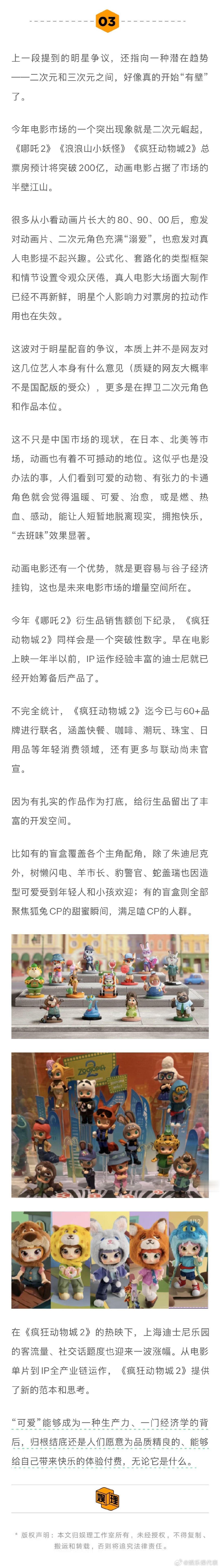 疯狂动物城2周边卖爆 为什么疯狂动物城2能救市 数据表明,《疯狂动物城2》占比最多的观众是二十多岁的年轻人,十年前他们可能还是被家长带着去电影院的孩子,如今已经成长为具有消费意愿和能力、愿意为喜欢的事物买单的成年人。影片在中国内地和北美同步上映,首周票房反超北美,说明在这部影片上,迪士尼对中国市场的重视是押对了宝:尽管一些宣传策略被认为是“南辕北辙”“用力过猛”…娱理独家↓