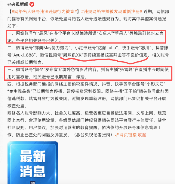 好几个你经常看到的,没想到也翻车了。安卓人,苹果人,这个前段时间闹得全网都知道的,还上大媒体。张雪峰也上榜了。。。。网络名人账号违法违规行为被查违规网络主播被发现重新注册