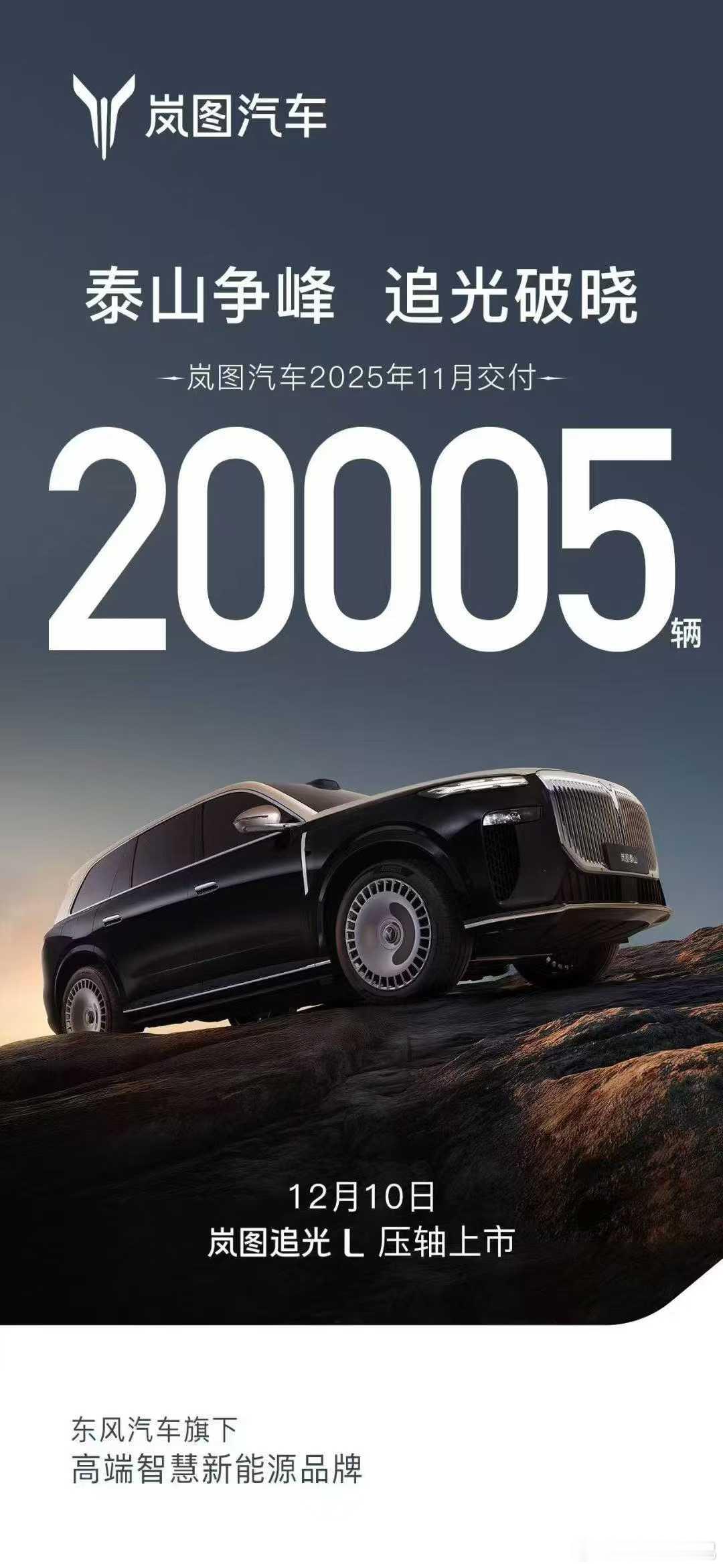 岚图今年的表现太猛了!我直接破防!岚图这波太猛:11月交付居然冲到20005辆,信息量大到让我一激灵。新出的泰山也没开玩笑,三腔空悬加华为智驾的组合,妥妥同级别卷王,周围朋友讨论声都起来了,真有人准备冲。更关键的是12月10日还会上旗舰轿车追光L!有泰山珠玉在前,追光L肯定不会差,我已经搬好小板凳等它上市,直觉12月的销量还要再爆一次。蹲追光L的同学在吗?评论区聊聊你们最期待啥配置!华系豪华12月10日岚图追光L压轴上市岚图销量创纪录12月再发新车岚图汽车