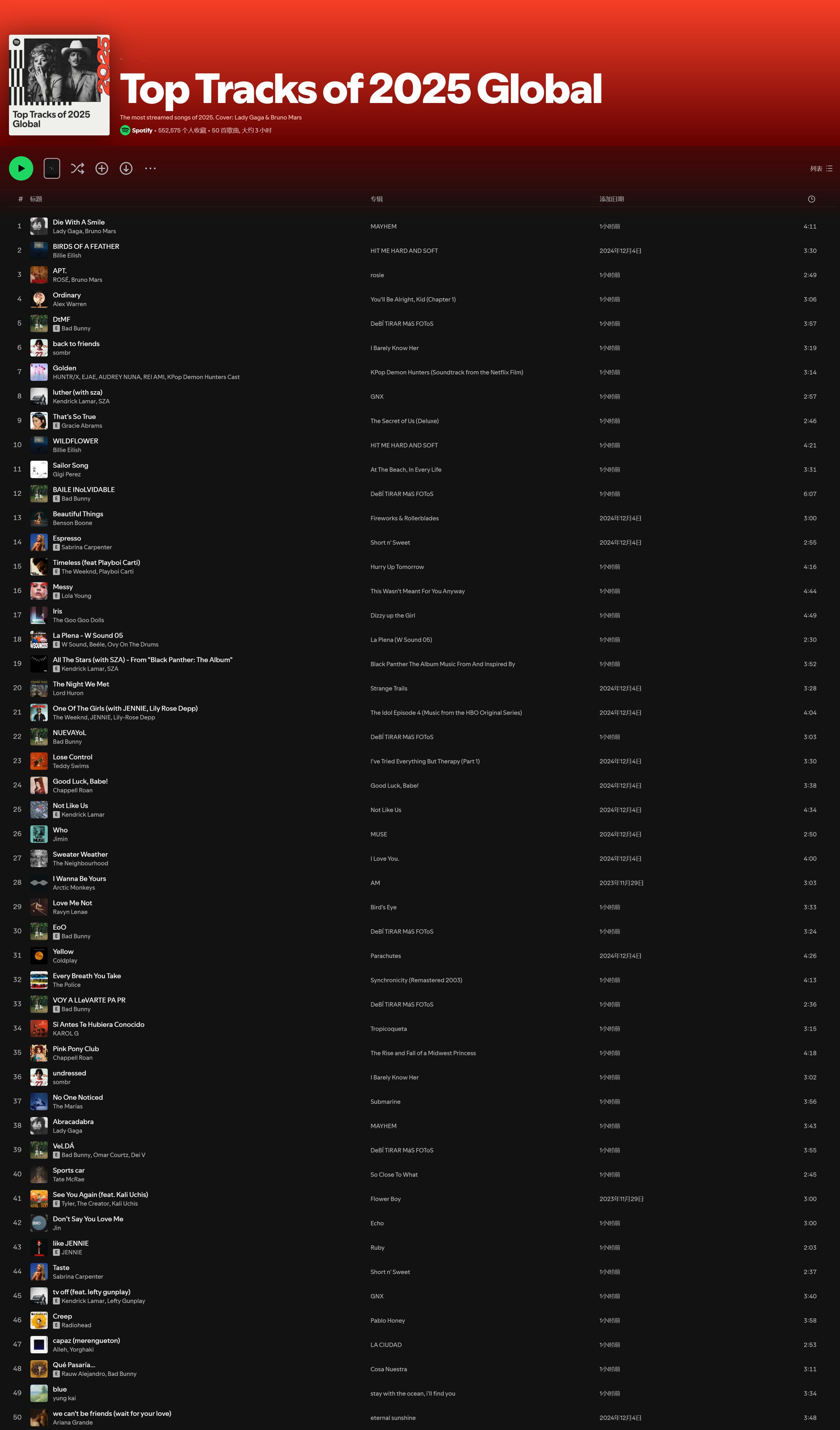 Spotify发布2025年全球最热门金曲年榜Top 50揭晓!Lady Gaga联手火星哥Bruno Mars爆单Die With A Smile无悬念获得年冠!碧梨Billie Eilish爆单BIRDS OF A FEATHER获得年亚!ROSÉ朴彩英和火星哥爆单APT.获得年季!恭喜!年度Top 10:1. “Die With A Smile” by Lady Gaga and Bruno Mars2. “BIRDS OF A FEATHER” by Billie Eilish3. “APT.” by ROSÉ and Bruno Mars4. “Ordinary” by Alex Warren5. “DtMF” by Bad Bunny6. “back to friends” by sombr7. “Golden” by HUNTR/X, EJAE, AUDREY NUNA, REI AMI, KPop Demon Hunters Cast8. “luther (with sza)” by Kendrick Lamar and SZA9. “That’s So True” by Gracie Abrams 10. “Wildflower” by Billie Eilish