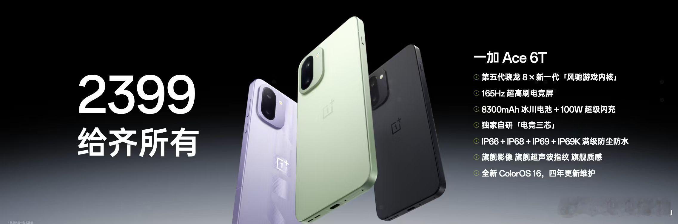 总结下刚刚发布的 一加Ace 6T 共有掠影绿、闪速黑、电光紫三款配色。全球首发第五代骁龙8,LPDDR5X Ultra 内存+UFS 4.1 闪存。搭载 一块6.83 英寸 165Hz 直屏。续航方面来到了8300mAh,支持 100W 快充。支持 IP66/68/69/69K 满级防尘防水,3D 超声波指纹,OPPO 晶盾玻璃,全新 ColorOS 16。 首发到手价 2399 元起,这次还有一款神里绫华定制版 3699 元。