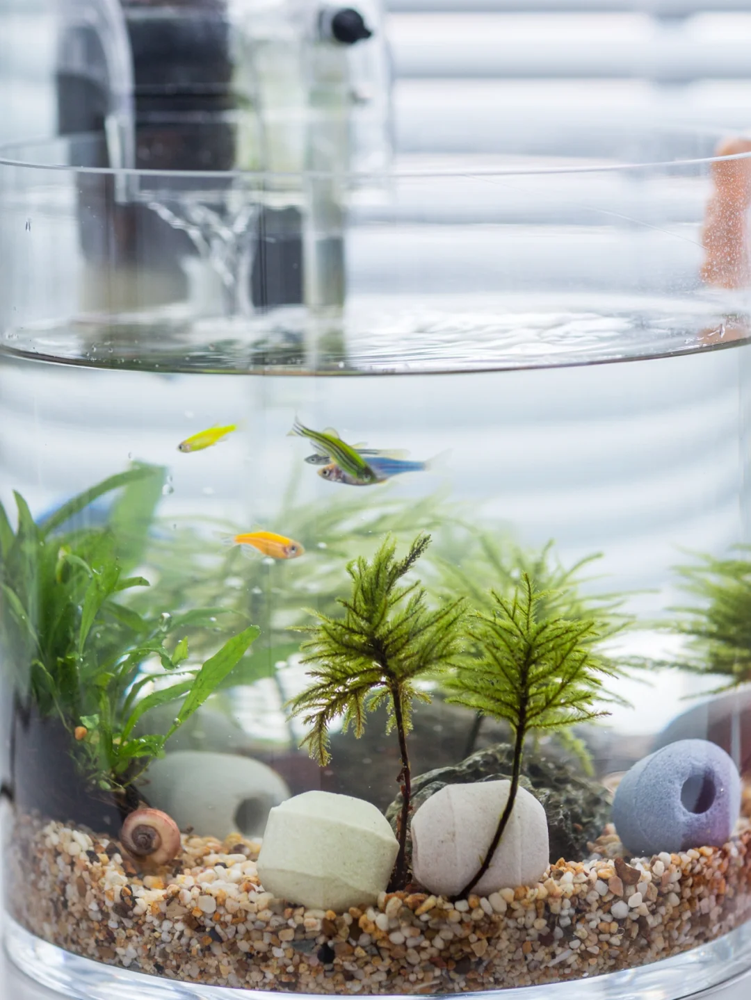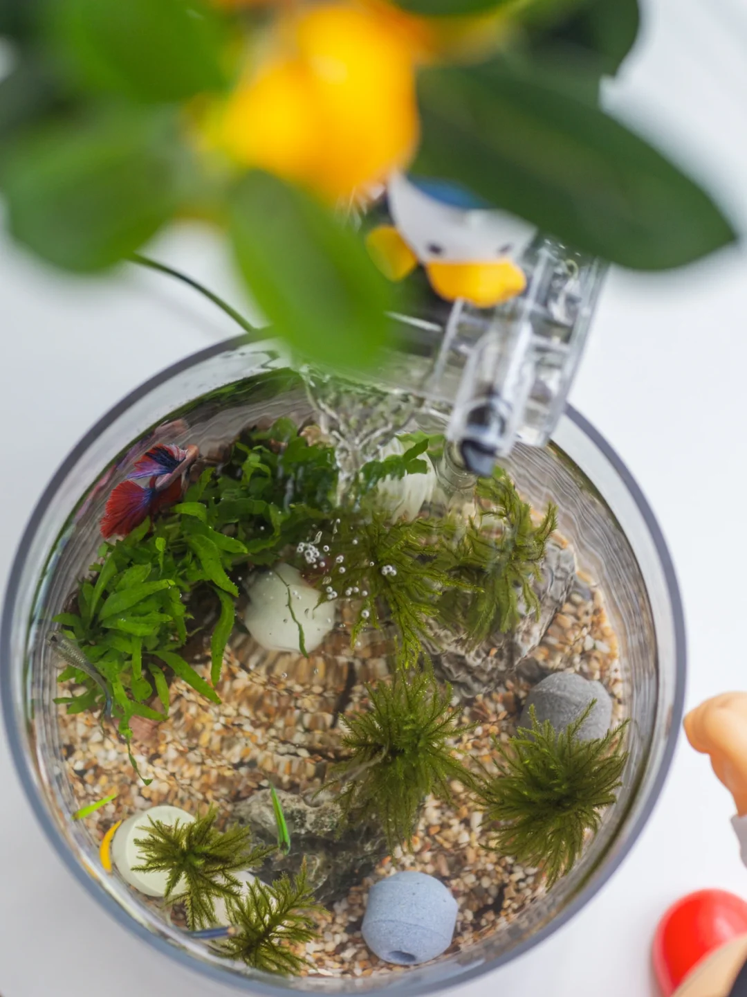 今天重新调整了一下鱼缸内的布景。取走了一块大石头,新入的万年藓水草挺好看,像一棵棵小树苗。也放了几颗滤材5D纳米球,可以起到净化水质,培养硝化细菌。