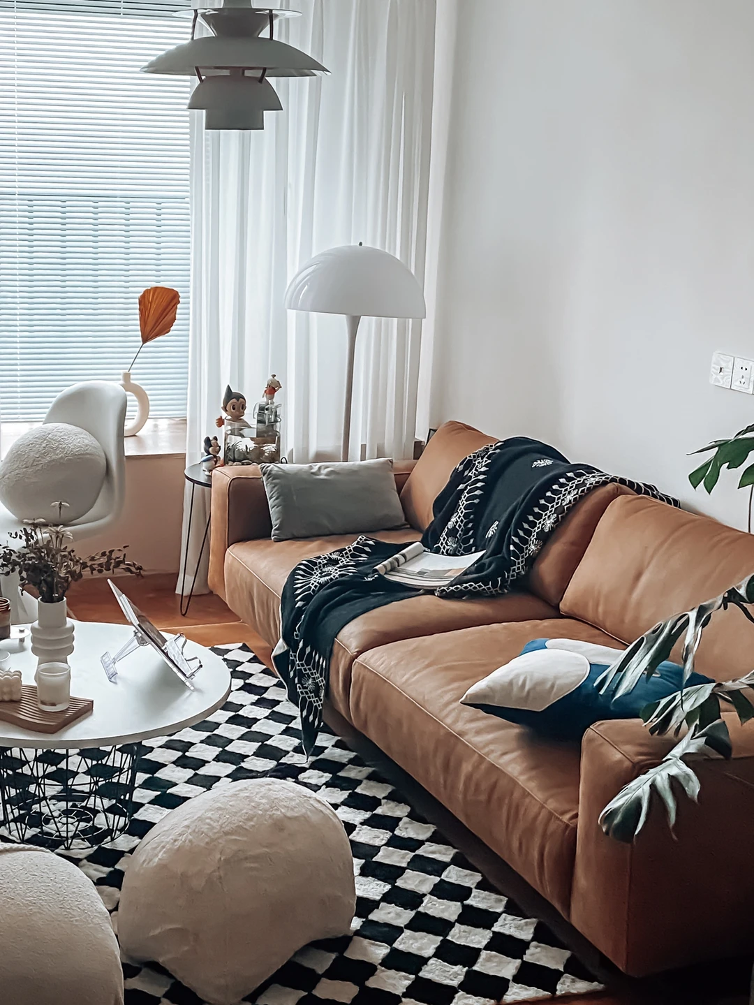 换了黑白棋盘格羊毛地毯,光脚踩着也很舒服。