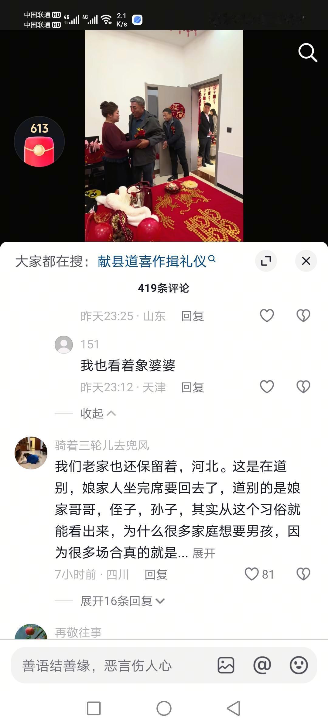 闺女给人家送去,难道就完了吗? 刷到了献县一位朋友送亲的视频,婚礼举行完毕,娘家人就要离开了,留下新娘子一个人在婆家。 今天以后,闺女就成了外人,成了人们口中“嫁出的女,泼出的水”,以后闺女回娘家就是走亲了,就是客人!!! 娘家人恋恋不舍啊,他们来到新娘身边道别,平辈或者长辈拱手作揖,和新娘拥抱告别,泪水不觉洒满了面庞;晚辈们进来给姑姑或者姑奶叩头行礼,这是血脉相连的亲戚。 这个细节令我很感动。我也参加过送亲,也娶了儿媳妇,这样的礼节还是第一次见到,真得很有人情味,很温暖。