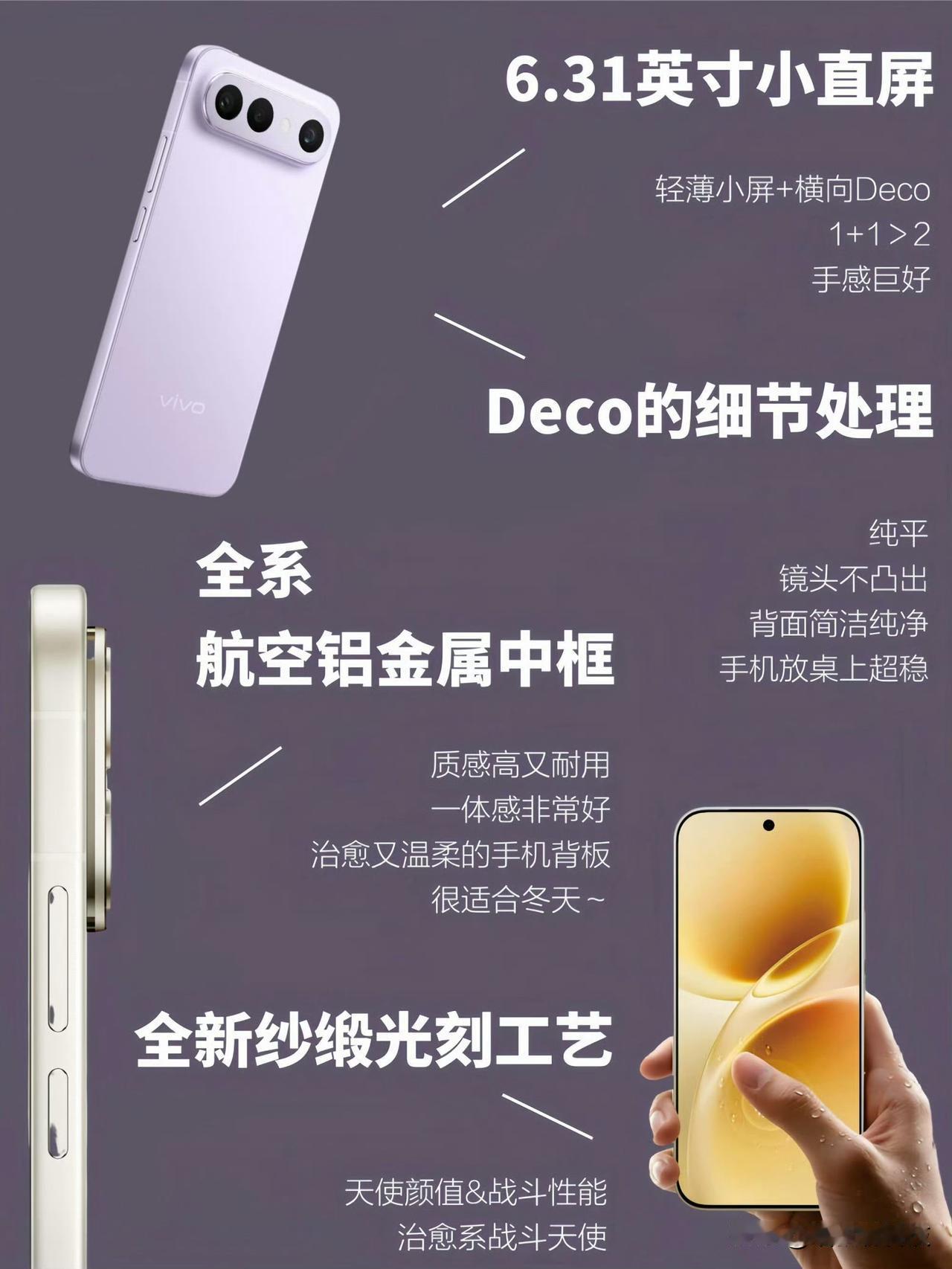 vivo S50 Pro mini 距离爆款只差一个售价! vivo S系列今年真是学乖了,居然搞出了这么一台“小钢炮”~ 6.31英寸1.5K直屏+横向无遮挡Deco,手感可以预料到的不错; 骁龙8 Gen5(台积电N3P工艺)+LPDDR5X Ultra内存 + UFS 4.1闪存,性能提升不小; 后置5000万像素索尼LYT700V或IMX906传感器(1/1.56英寸大底)+5000万像素索尼IMX882潜望式长焦(1/1.95英寸),前置5000万防畸变柔光自拍,在人像和远景细节上同时发力,实际表现值得期待; 6500mAh蓝海电池+ 90W有线快充 + 40W无线充电,不算夸张但妥妥够用; 另外3D超声波指纹2.0(湿手秒解锁)、IP69+IP68双重防水、X轴线性马达、立体双扬声器都是标配。 整体配置看着还是相当能打的,就看随着供应链的成本增加,在最终的售价上是否有诚意了,希望能有惊喜~