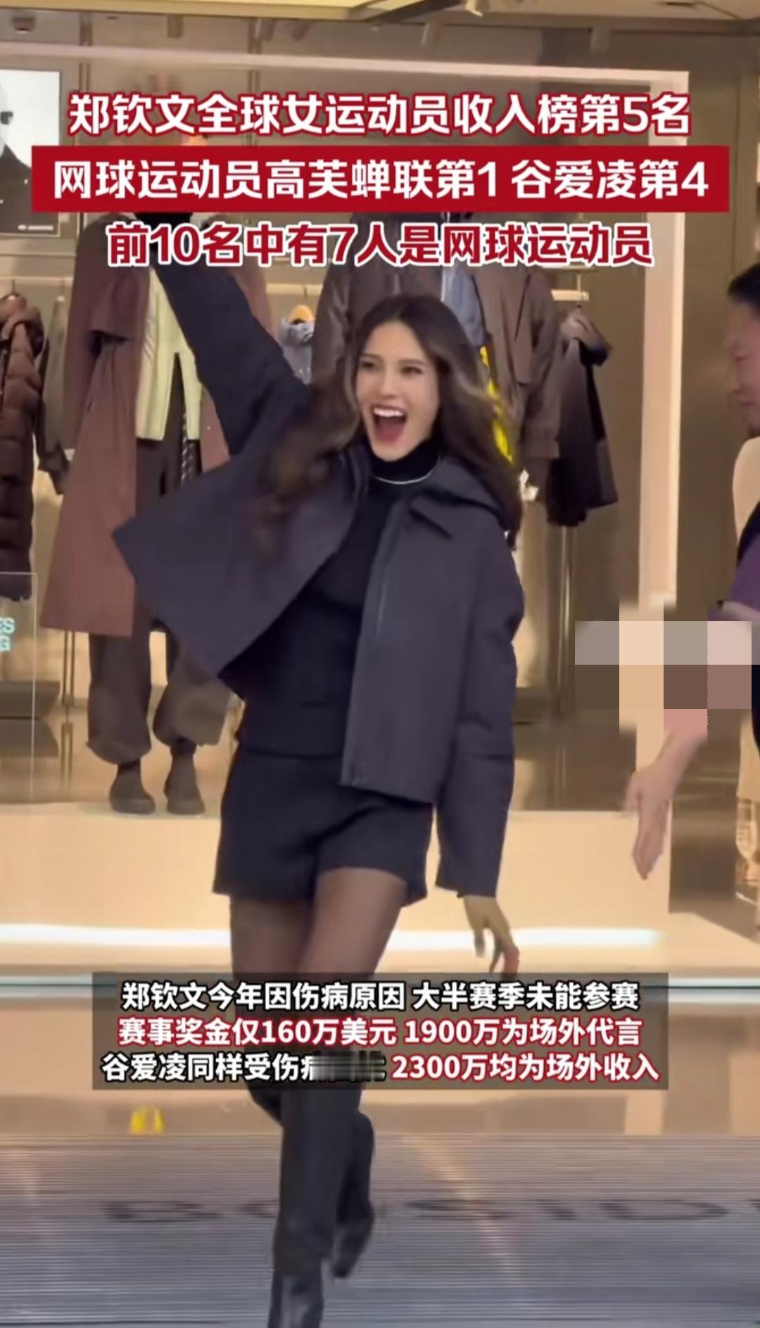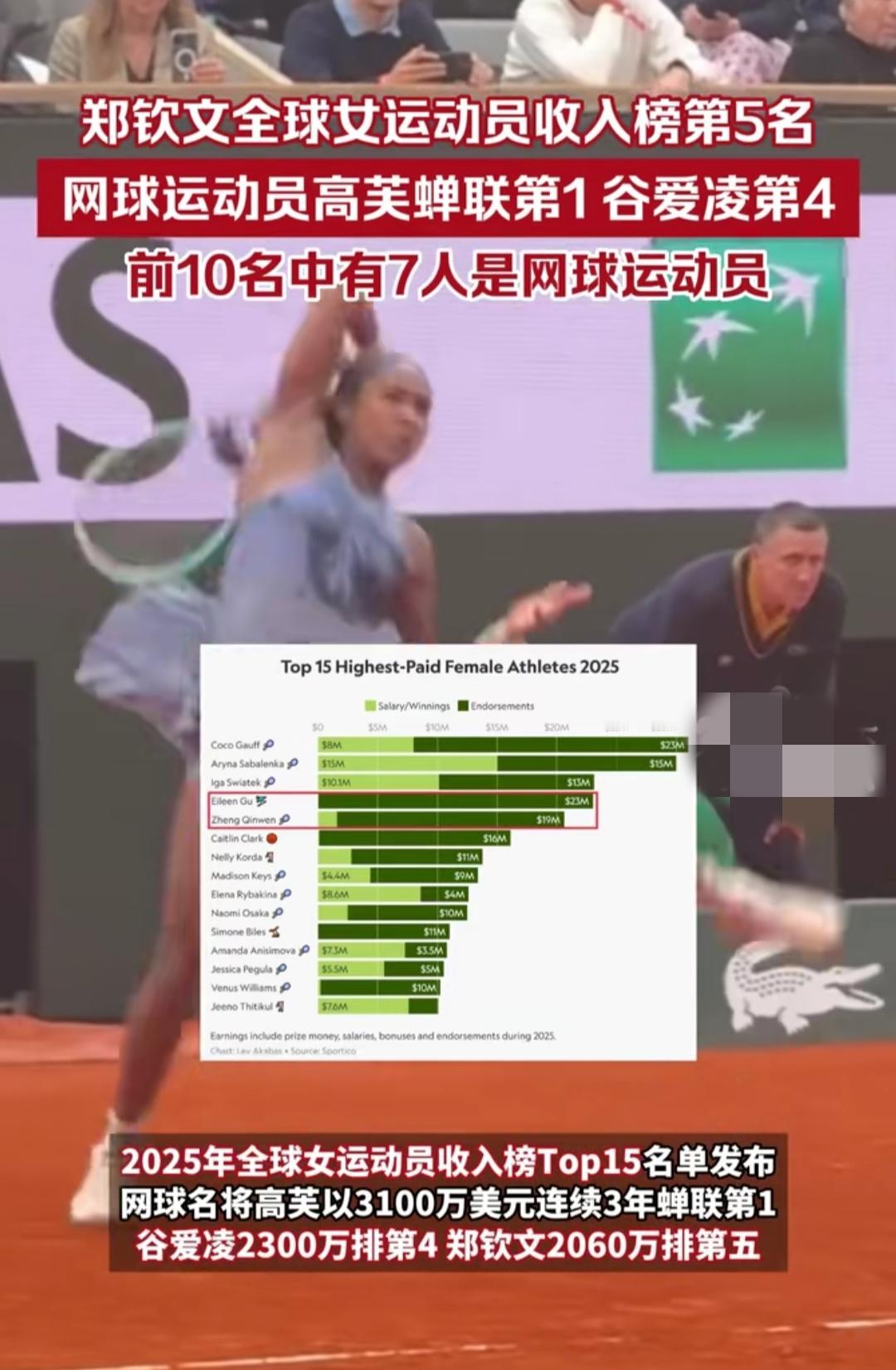 谁能想到2025全球女运动员收入榜一公布,前五中网球选手占四席,咱中国的谷爱凌、郑钦文还强势挤入前五,这成绩看得人热血沸腾。 榜单里高芙以3100万美元蝉联榜首,萨巴伦卡、斯瓦泰克紧随其后,前十五名中网球选手占了十个,商业化实力一目了然。谷爱凌2300万美元收入全靠场外代言,郑钦文顶着伤病,凭14个顶奢代言让收入逆势涨到2060万美元。 这榜单不光是冰冷数字,更是女运动员的实力底气。她们赛场拼成绩、场外闯商业,打破了“女性运动没市场”的偏见。谷爱凌和郑钦文更让世界看到,中国女运动员既能为国争光,也能在国际舞台站稳脚跟。而女性力量从来都不是口号,而是靠实力挣来的话语权。