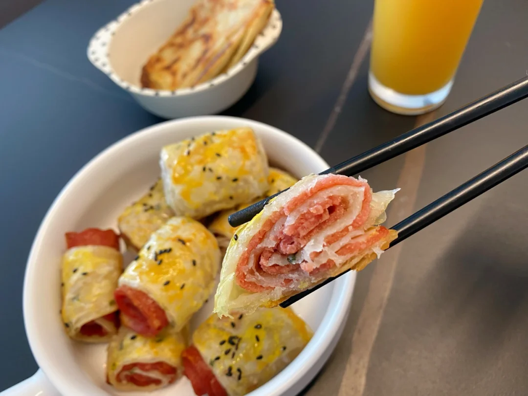 早餐打卡~ 这个手抓饼培根卷真的太好吃了 香香酥脆~