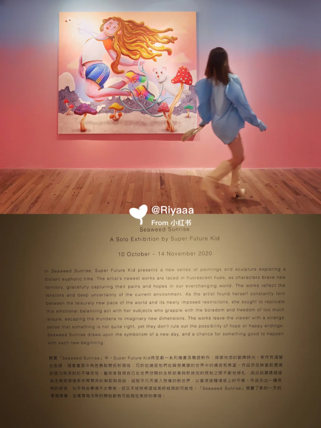 Super Future Kid是位1981年出生的德国人。她通过色彩斑斓的作品展现了她对永恒童年的不懈追求,对精彩生活的向往,并让观众体验自己超现实的童年般的奇幻和游戏感。在“Seaweed Sunrise”中,作者展示了一系列像梦境一样迷幻的绘画和雕塑。在雕塑和绘画之间相辅相成下,观众会有现实与超现实融合的视觉冲击。以粉蓝色为基调,整体展览第一眼会有童年般轻松欢快的感觉,但细品每幅画后,又会感觉到当前环境的紧张和不确定性。作者展现了自己在世界的新节奏与新施加的限制之间的不断挣扎。
