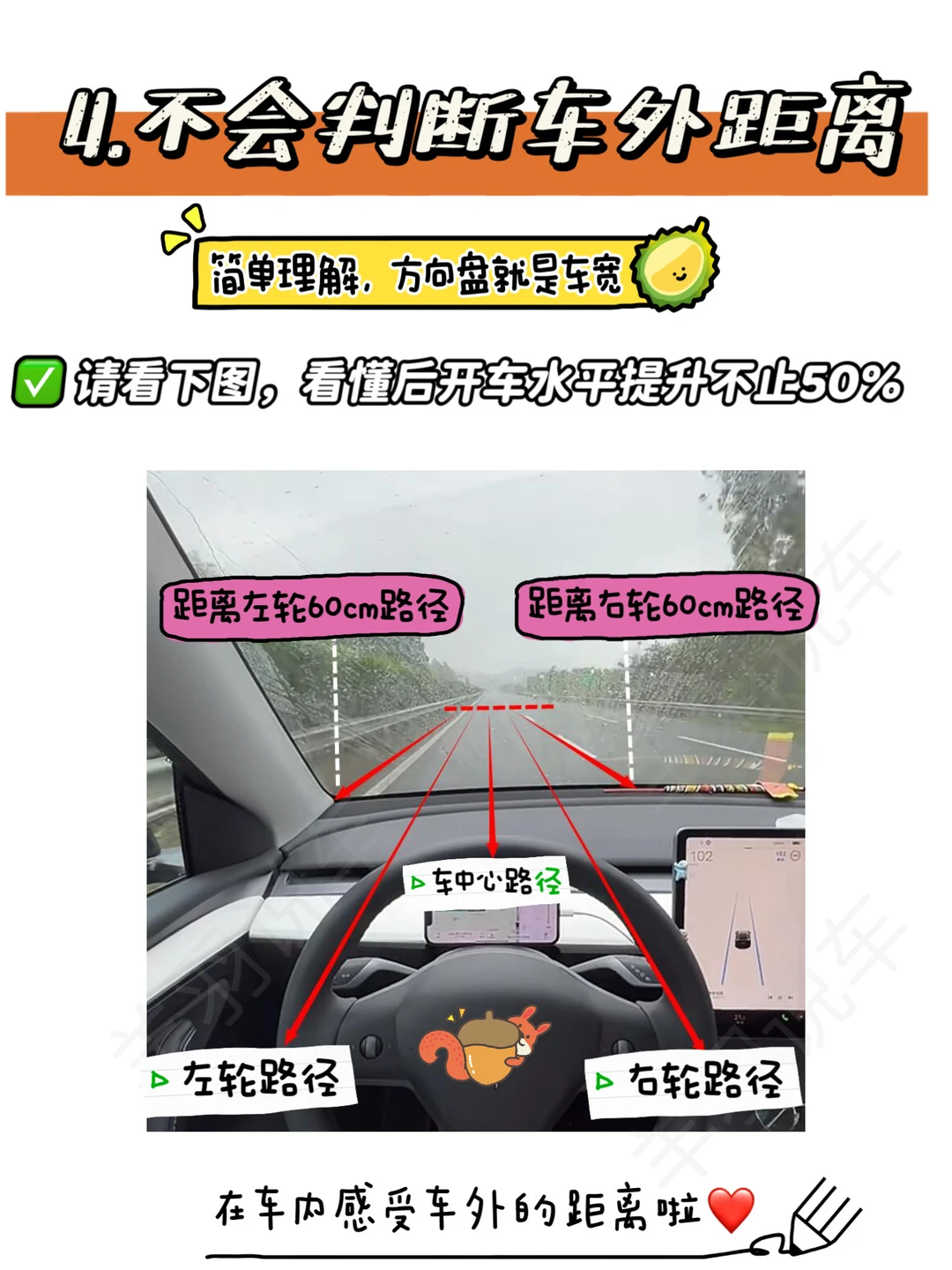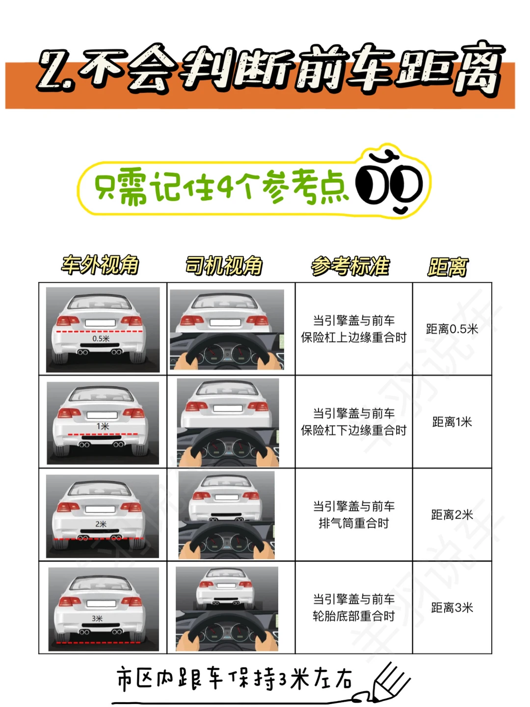 2⃣️有些人总是抱怨,开车老是有人插队,也不敢跟太近,其实在车内也是可以判断与前车距离的