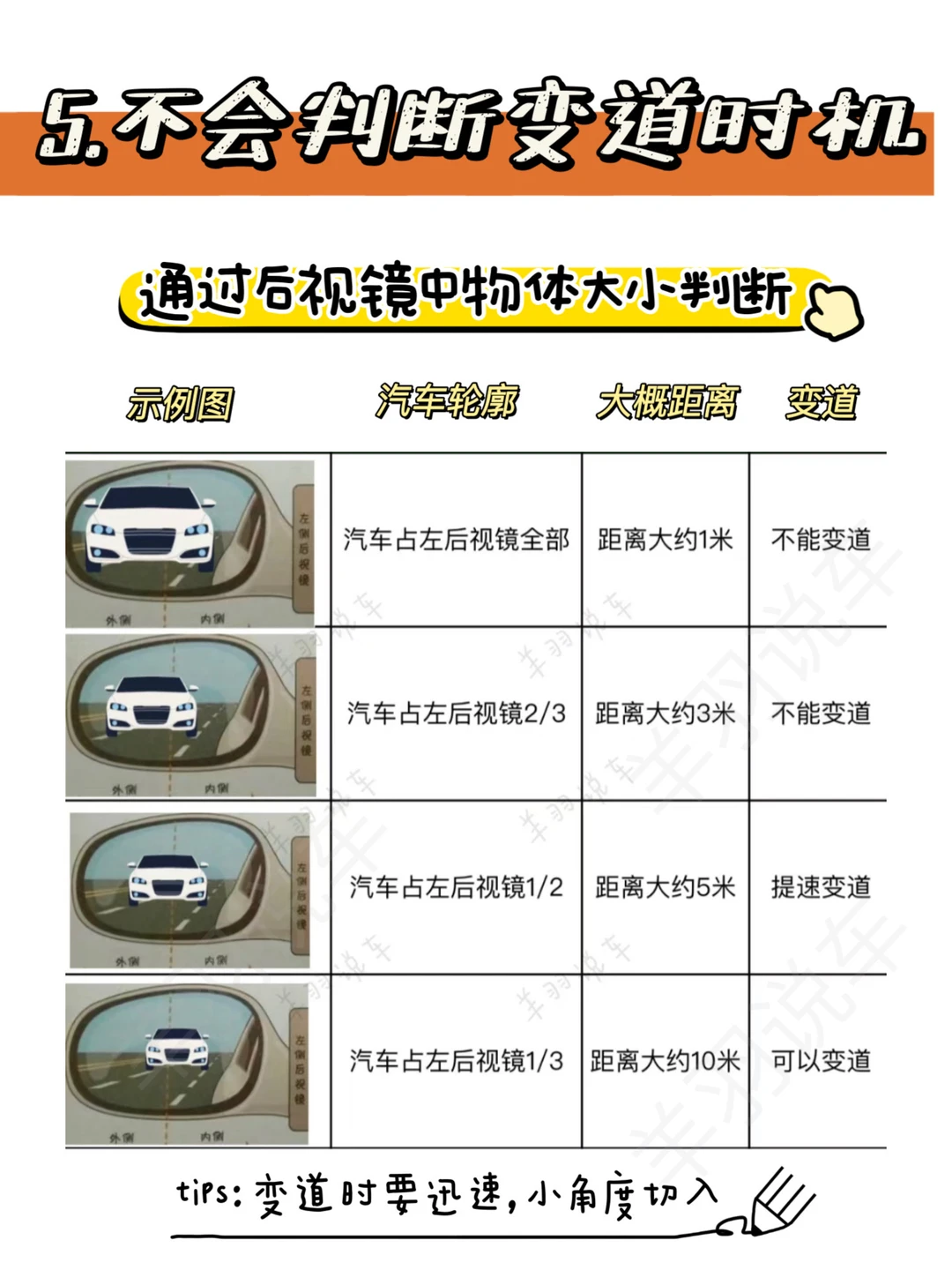 5⃣️不会判断变道时机,转向灯打了半天,就是不敢变,不知道后车距离多少