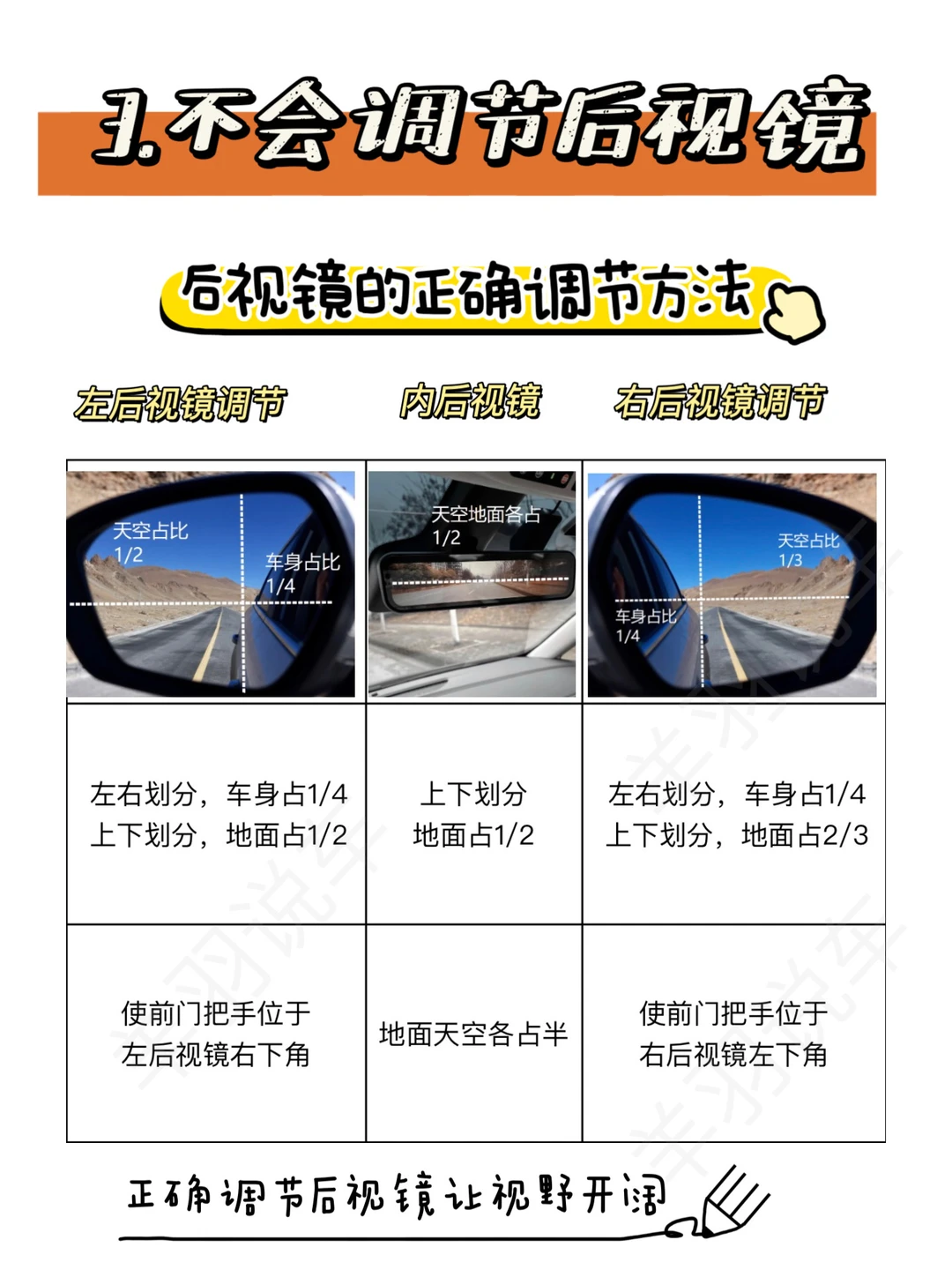 3⃣️不会正确调后视镜,就导致视野不够开阔,这在开车时无疑增大了风险