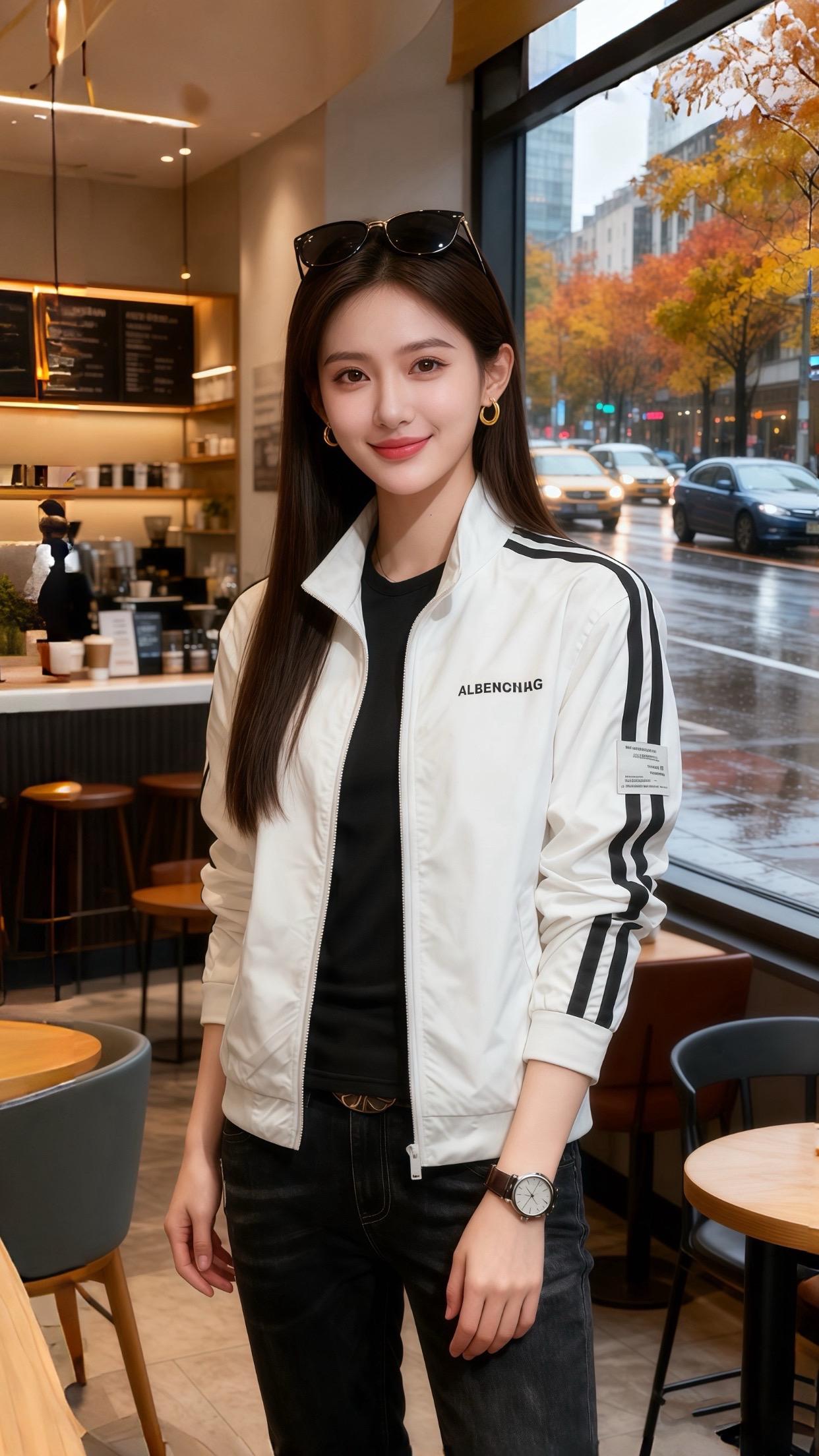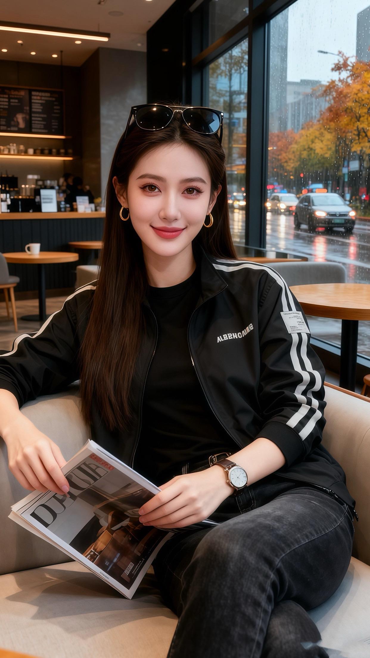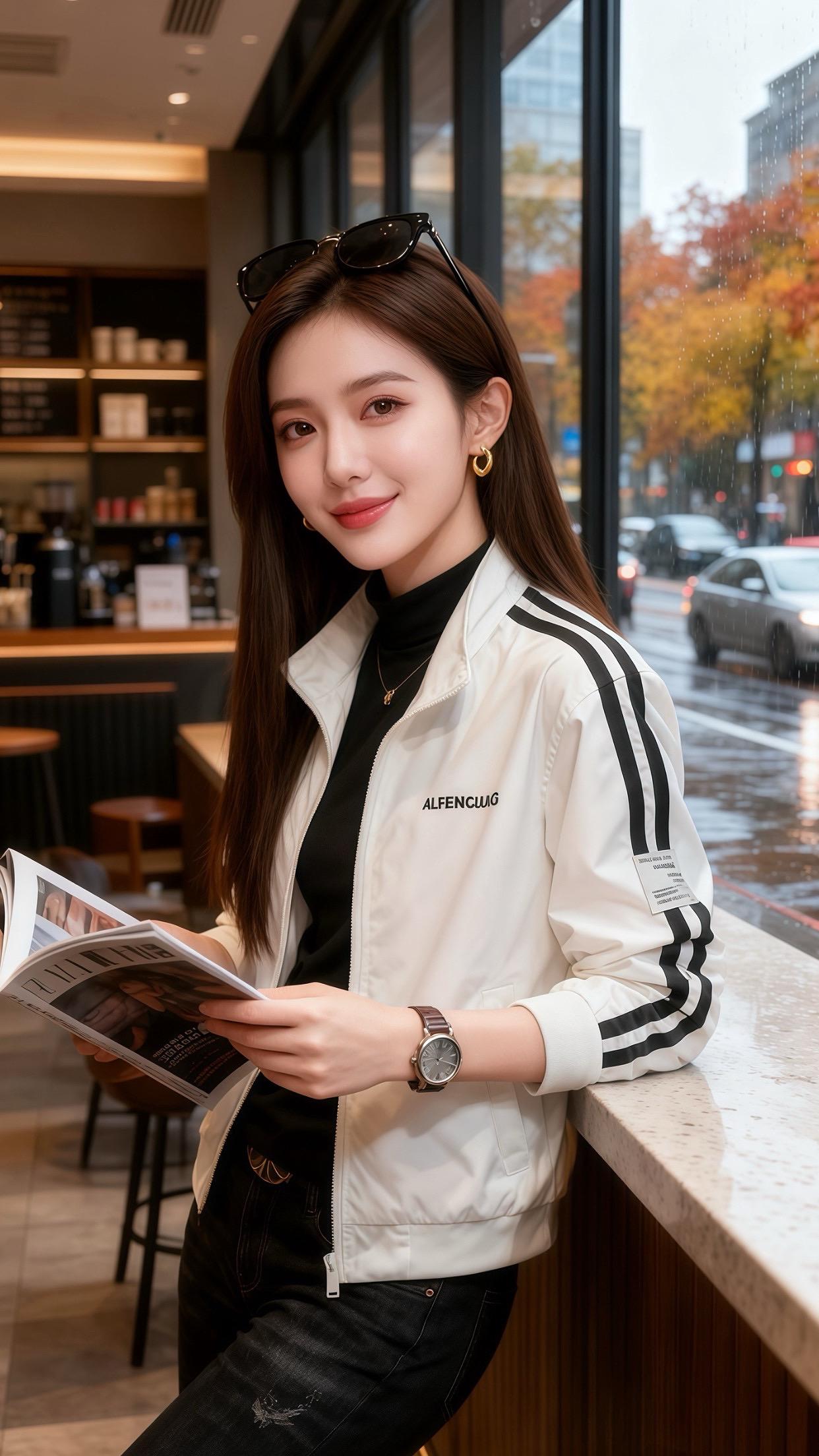 雨丝裹着秋意黏在咖啡馆窗上,许妍指尖捻着杂志页,肩线被米白夹克衬得利落——黑条纹顺着袖管落下来,像把她的笑揉进了松弛里。