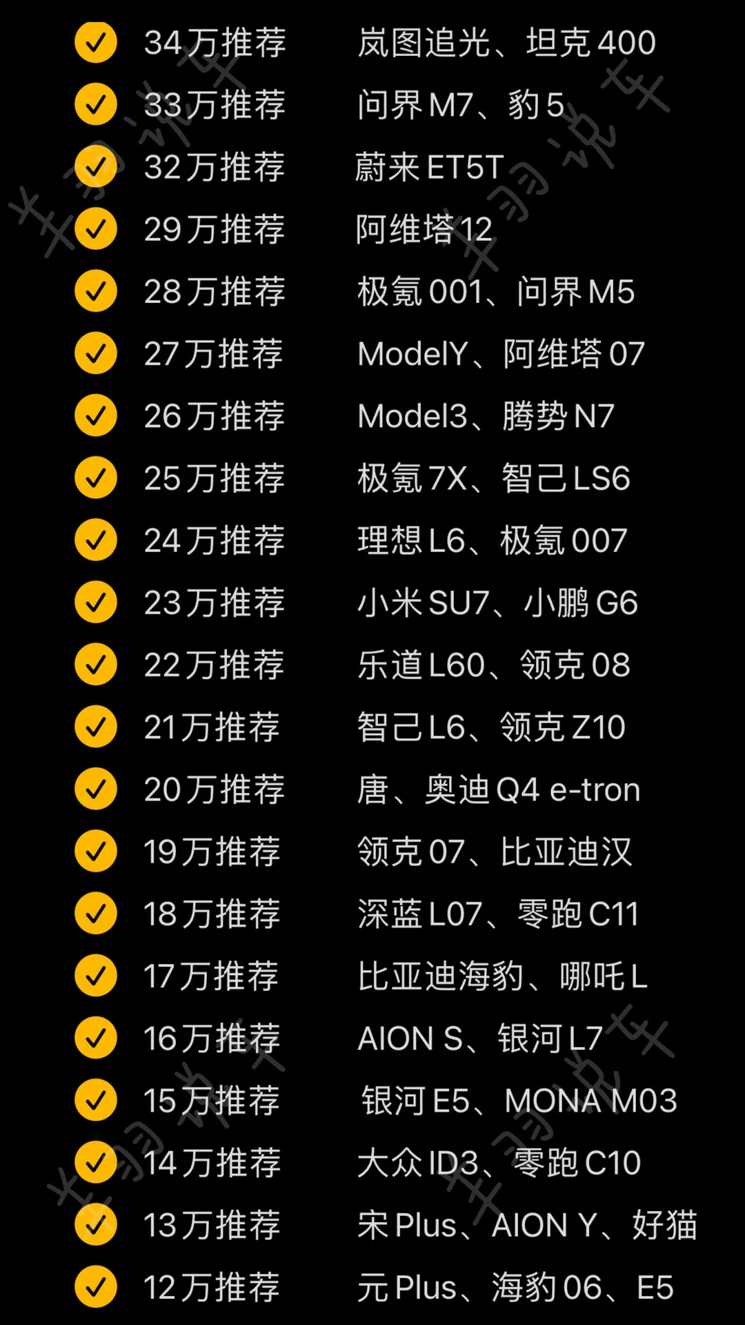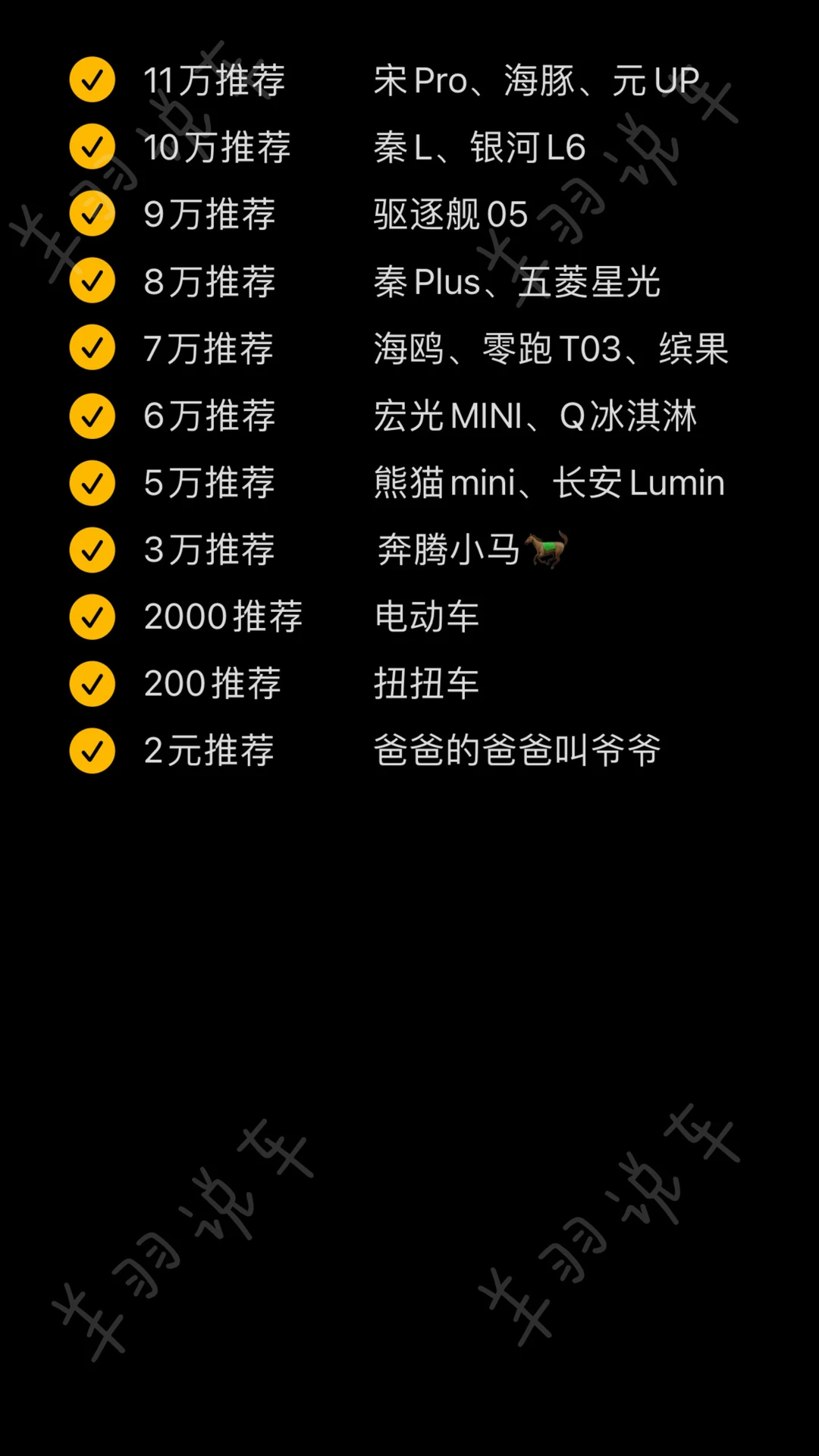 🚗很多人计划买辆新能源车,但是很纠结,因为市面上的新能源车五花八门,不知道怎么选,其实很简单,直接看口袋,口袋有多少,就选什么车!