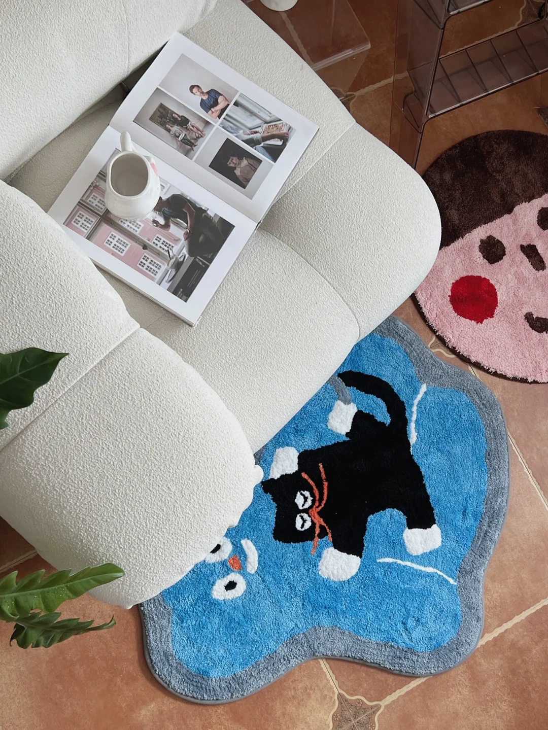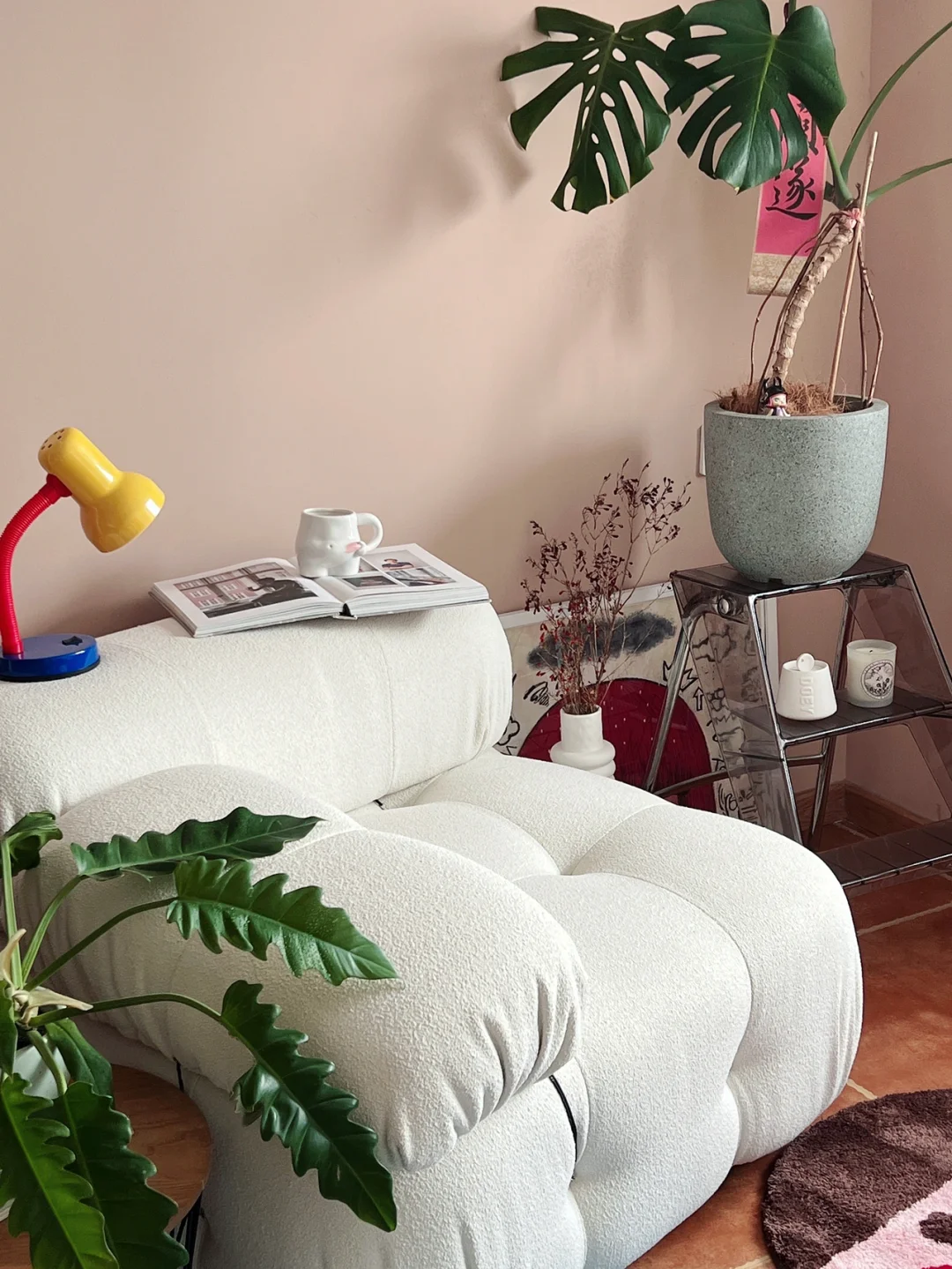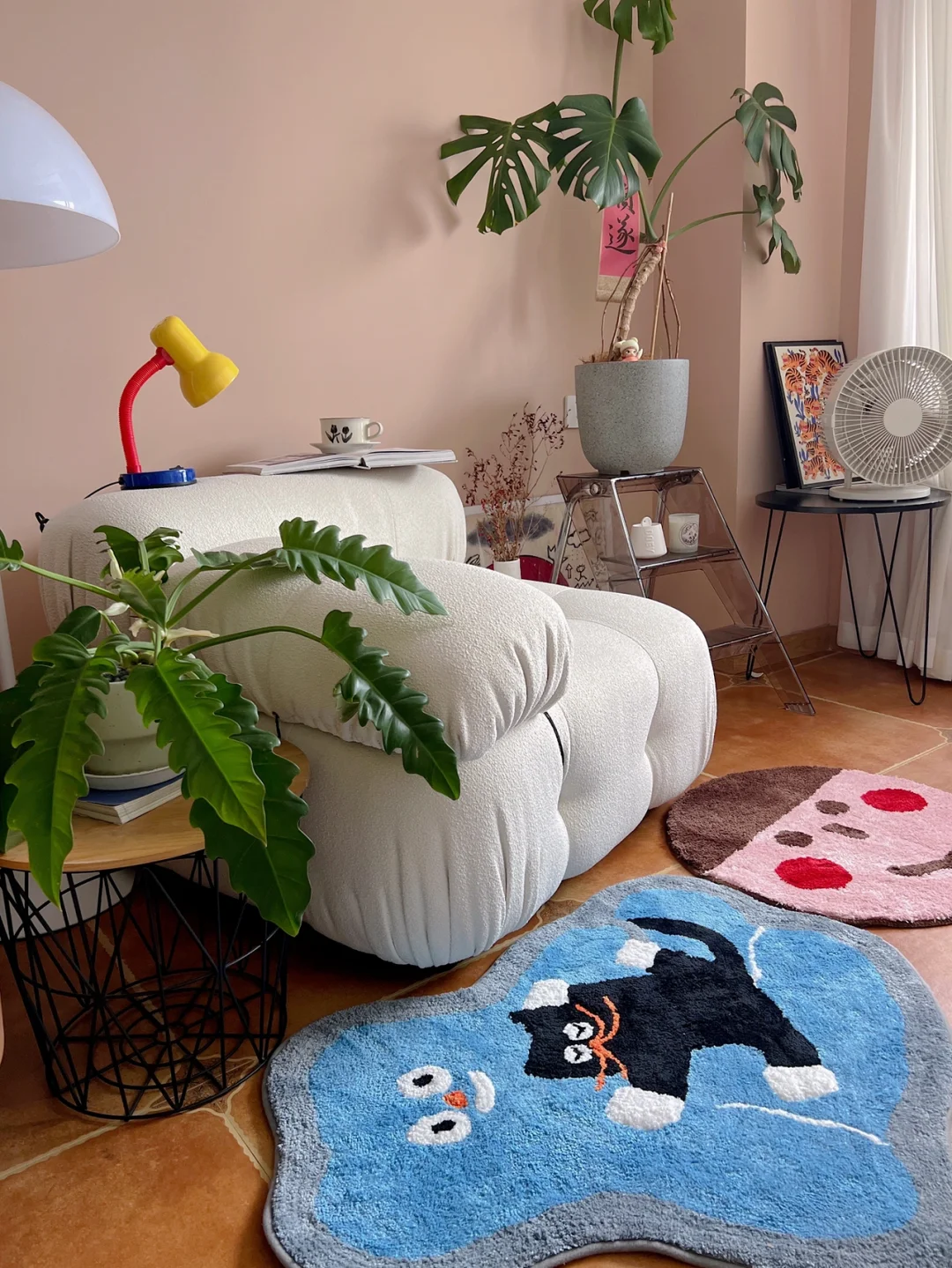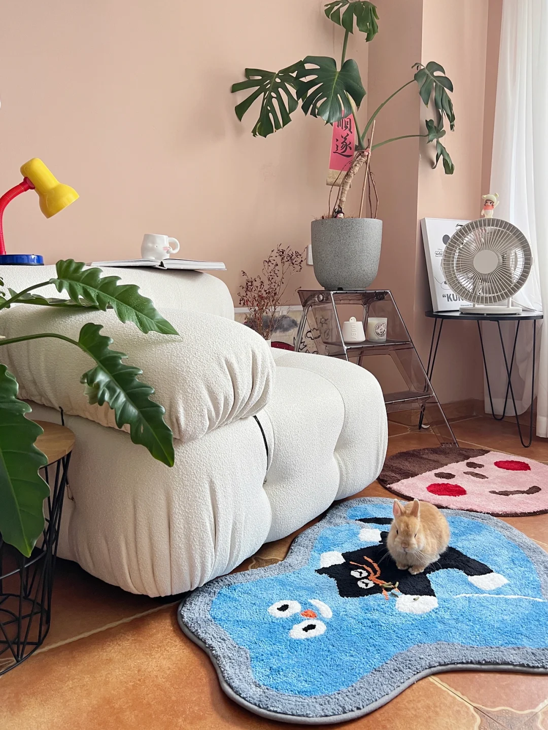 一直是色彩控,所以客厅的墙一面刷白,一面刷莫兰迪色。低饱和度的“粉”天生具有艺术与舒适感。 夏天到了,把客厅的大地毯都撤了,换上新入的小地毯,铺在地砖上,不影响清凉度又具有装饰性。随手放在单人沙发前,卡通猫咪+男孩笑脸与宠物兔🐰的组合现在是客厅最抢眼色彩了😛😋 透明折叠梯当花架,龟背竹最近状态一般,想着有空去花市再入几盆绿植。 🏷地毯:泡腾PointLab 🏷风扇:Muji 🏷折叠梯:BlueHome