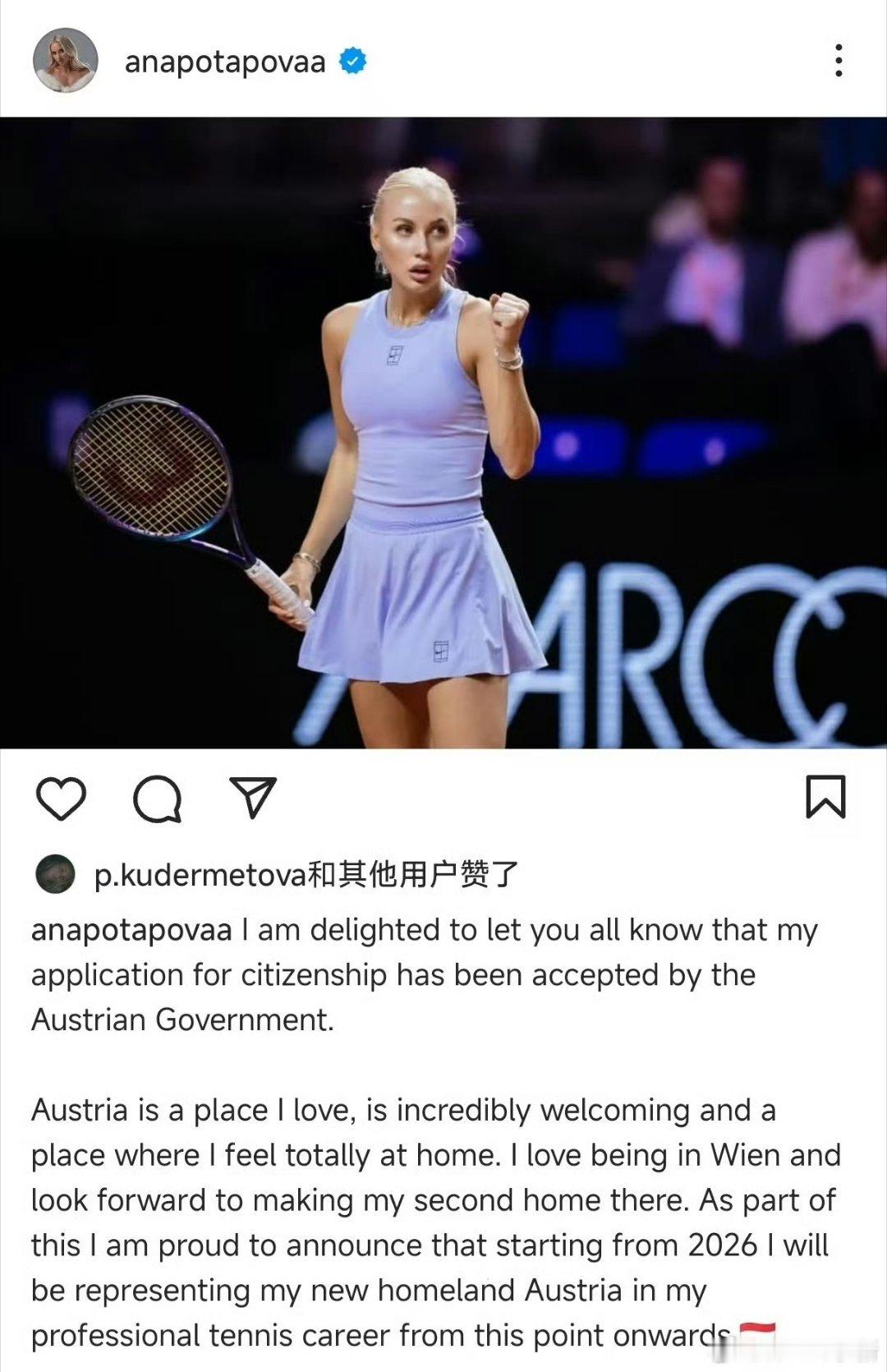 多名俄罗斯网球选手转国籍🎾波塔波娃在社交媒体宣布自己的公民身份申请获奥地利政府